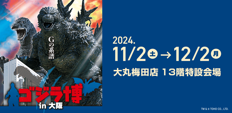 今夏東京・日比谷で開催し好評を博したイベント「ゴジラ博」をこの度、大丸梅田店に場所を移し「ゴジラ博 in 大阪」として開催することが決定しました。歴代ゴジラのスーツや立像、『ゴジラ-1.0』の大迫力ジオラマを展示し、ジオラマにはお客様がご自身のスマートフォン等を使って楽しめる特撮体験を提供。展示アイテムは東京開催時から一部を入れ替え、大阪にゆかりのある「スーパーX2」をはじめとする、空飛ぶメカを集めた「フライングメカニックコーナー」を新たに設けます。「ゴジラマーケット」で販売するイベント限定商品も登場します。秋はぜひ大阪でゴジラ70年の歴史をご体感ください!