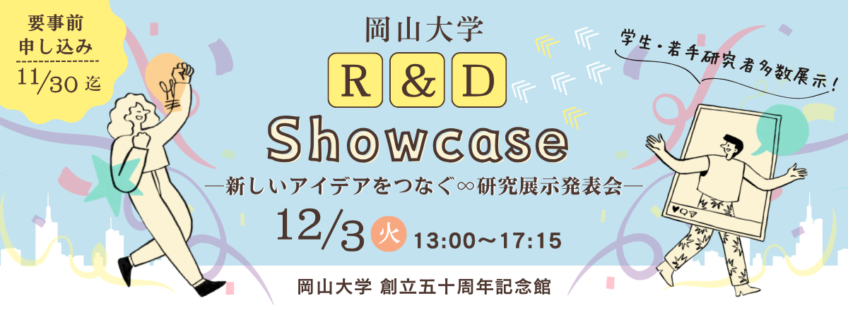 研究者と学生による説明×研究成果の実物展示で次世代技術を体感できる研究シーズ展示会「岡山大学 R&D Showcase」を12月3日に開催します。