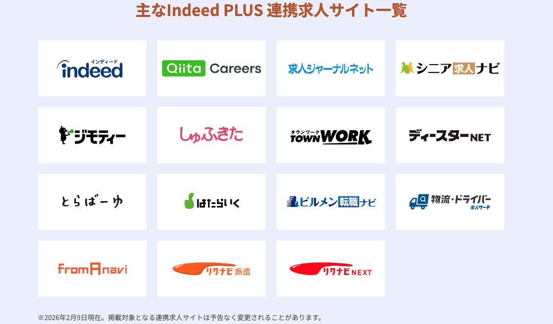 【プレスリリース】求人配信プラットフォーム「Indeed PLUS」のネットワークがさらに拡大!最大15の求人サイトを通じ、多様な求職者に求人情報を配信可能に(Indeed Japan株式会社):https://jp.indeed.com/news/releases/20260216