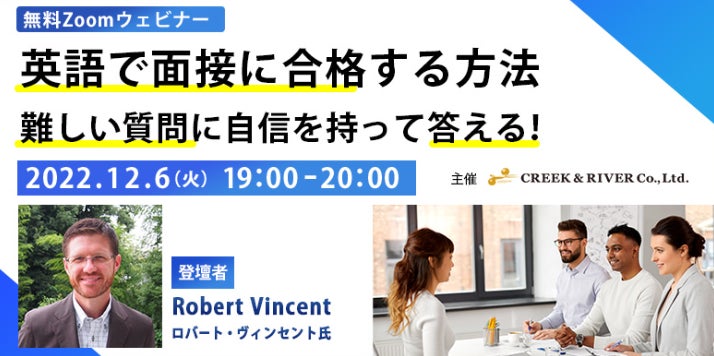 株式会社クリーク・アンド・リバー社(C&R社)は12月6日(火)、グローバル企業で働きたい方々を対象に、無料のオンラインセミナー「英語で面接に合格する方法 ~難しい質問に自信を持って答える!~」を開催いたします。