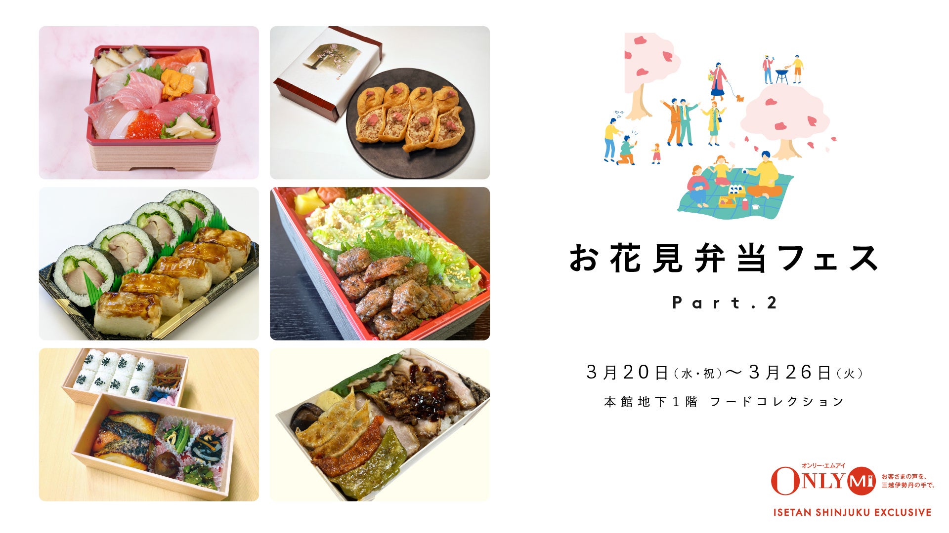3月15日(金)~3月26日(火)の期間は、お花見シーズンにあわせた「お花見弁当フェス」を2週に渡り初開催いたします。「お花見弁当」にフォーカスした今回は、《Part.1》と《Part.2》で総勢24ブランドが伊勢丹新宿店限定のお花見弁当をご用意。いなり寿司にうなぎ、餃子やステーキ、海鮮丼などお花見をしながら食べるのに嬉しいものばかり。是非この機会にお立ち寄りくださいませ。