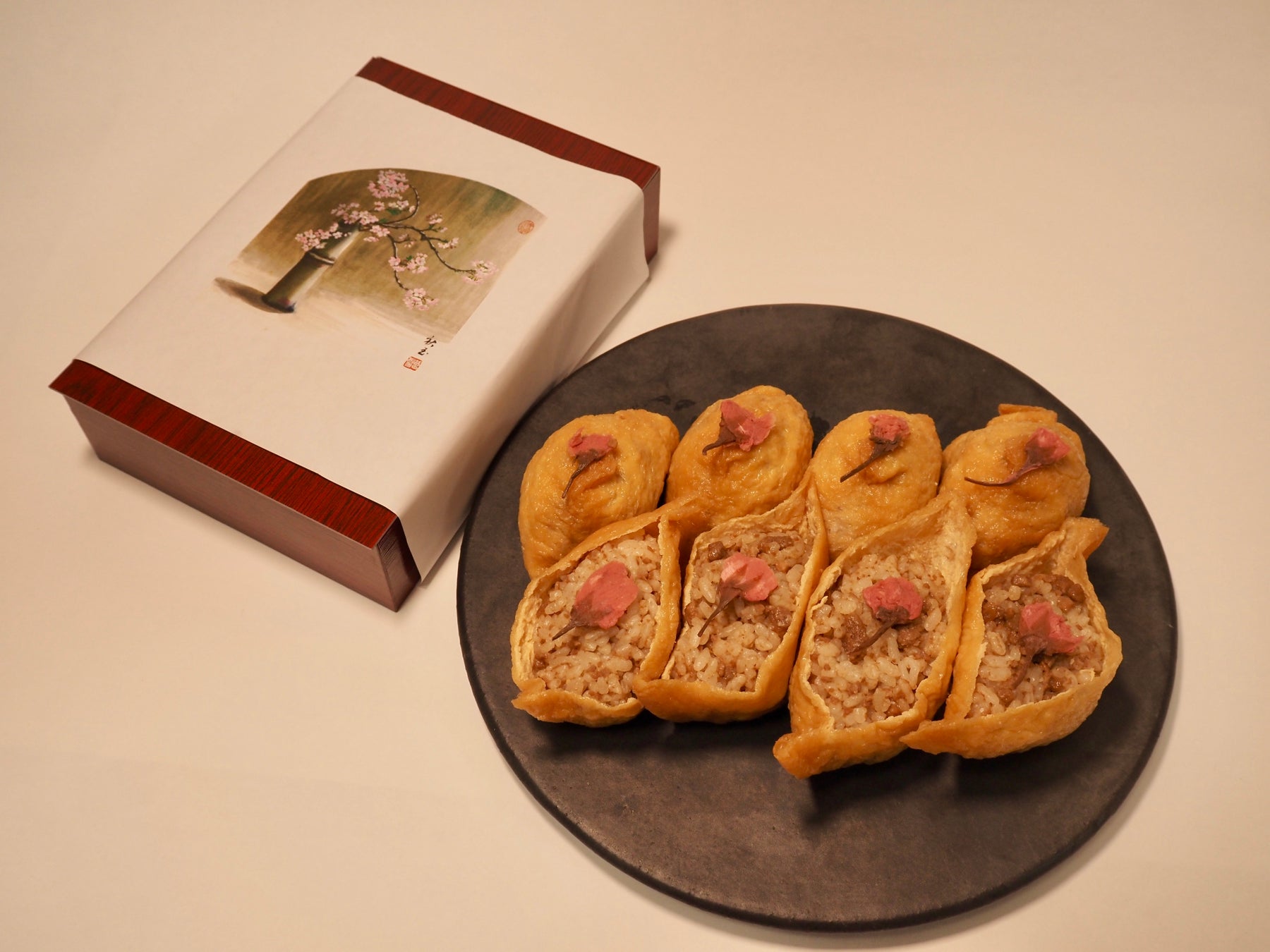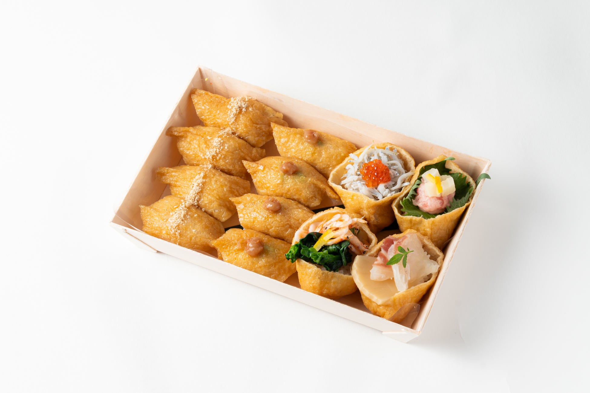 定番の一口いなり、わさびと梅いなり、爽やかな香りの柚子酢飯に桜海老、菜の花、鯛やしらすなど春を感じられる食材をたっぷり詰め込んだオープンいなりの限定セット。