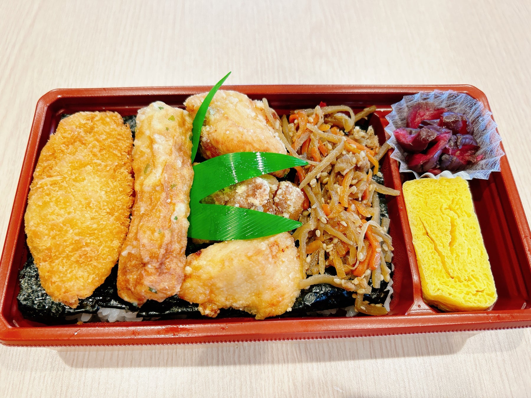 人気の中津からあげに、とり天、ちくわ、白身フライなど具材たっぷりの海苔弁。白ごはんの上に自家製のそぼろを散りばめています。