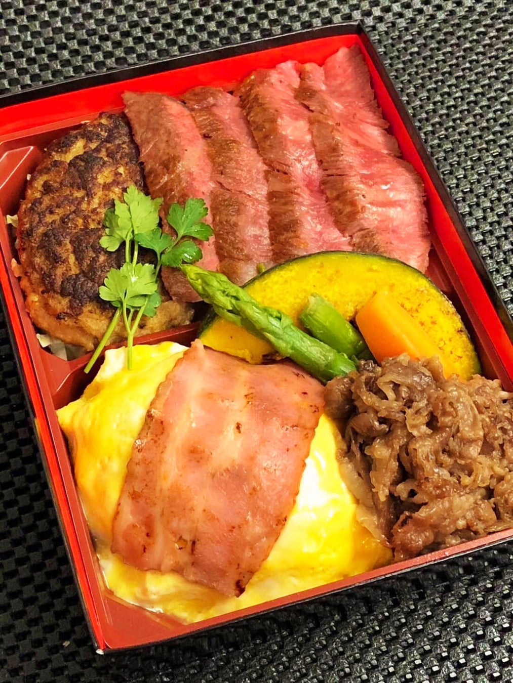 <ステーキハウスALLEY>人気のハンバーグステーキに加え、牛ヒレと牛ロースの2種類のステーキ肉を豪華に盛り込みました。ハンバーグもステーキも両方堪能できるボリューム満点の特製お花見弁当です。