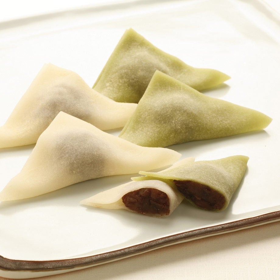ほど良い⽢さの粒あんを柔らかいニッキと抹茶の⽣⼋ッ橋で包みました。