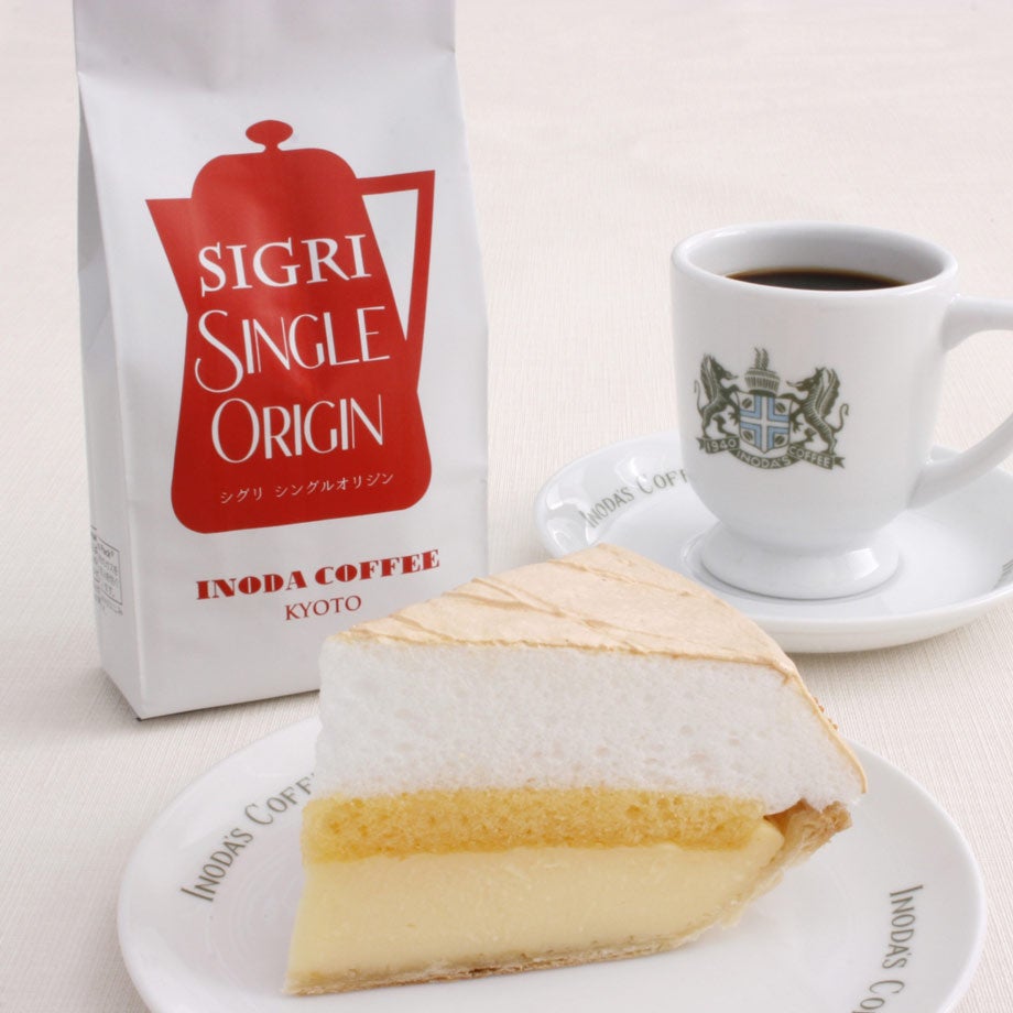 海抜1,550m の標⾼、清涼な気候、⼗分な降⽔量、豊かな⼟壌、そして「1⽇で1年分の気候を繰り返す」と⾔われる気候の変化など、コーヒーの⽣育には理想的な環境で育まれたコーヒーが「シグリ シングルオリジン」。⾹り、コク、まろやかな⽢みのバランスが良く、フルーティな⾵味がすっきりとした後味が特徴です。発酵バターを使ったパイ⽣地にレモンの⾵味を活かしたカスタードクリーム、メレンゲをたっぷりとのせて焼き上げた、⼈気のレモンパイも併せてご賞味ください。
