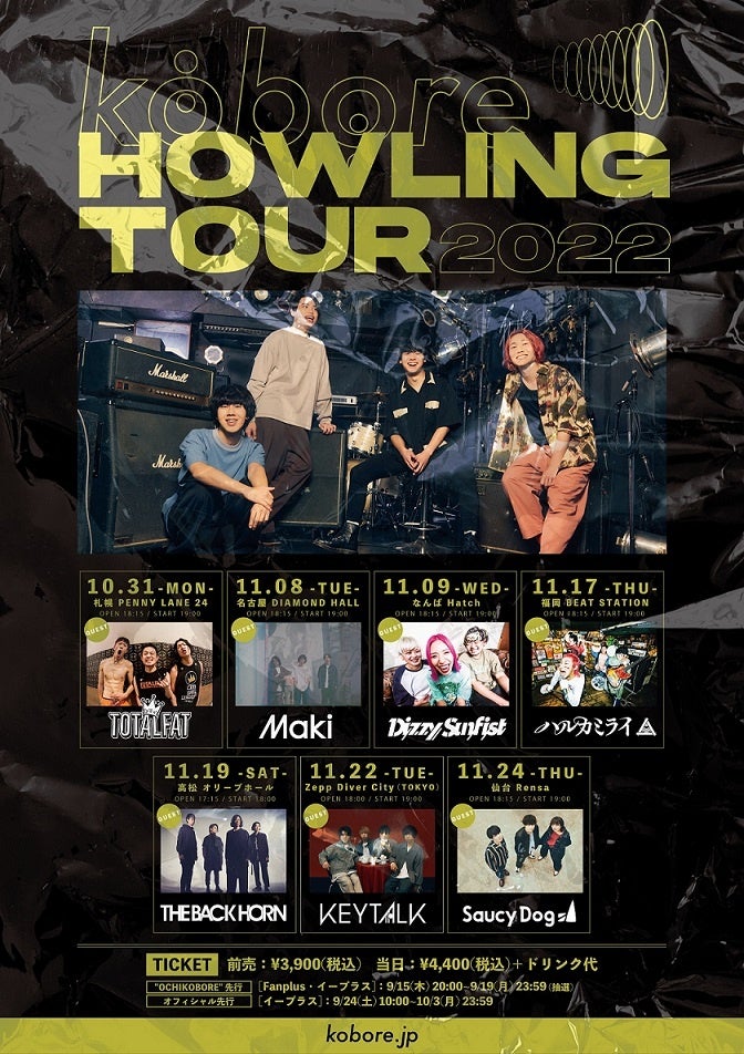 全国7箇所をまわる対バンツアー『kobore 「HOWLING TOUR 2022」』が10月31日(月)札幌 PENNY LANE 24を皮切りにスタートする。現在、各公演のチケットが先着順で一般発売受付中( eplus.jp/kobore2022/ )なので早めにゲットしよう!