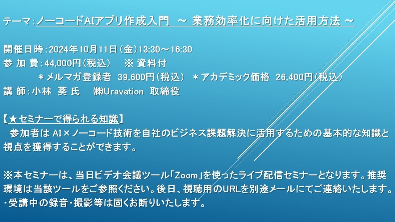 【ライブ配信セミナー】ノーコードAIアプリ作成入門 ~ 業務効率化に向けた活用方法 ~ 10月11日(金)開催 主催:(株)シーエムシー・リサーチ
