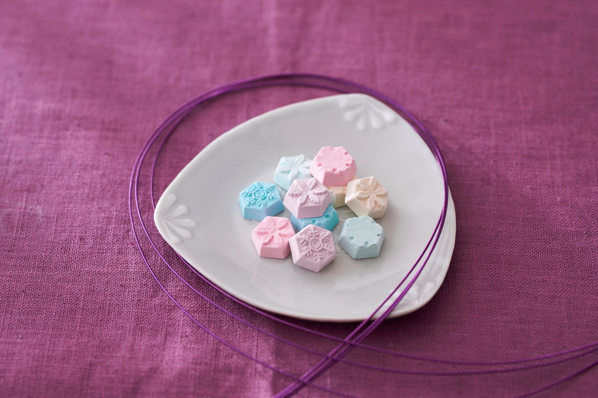 現代風の加賀五彩と雪の結晶をイメージした愛らしい落雁。2026年の限定品です。