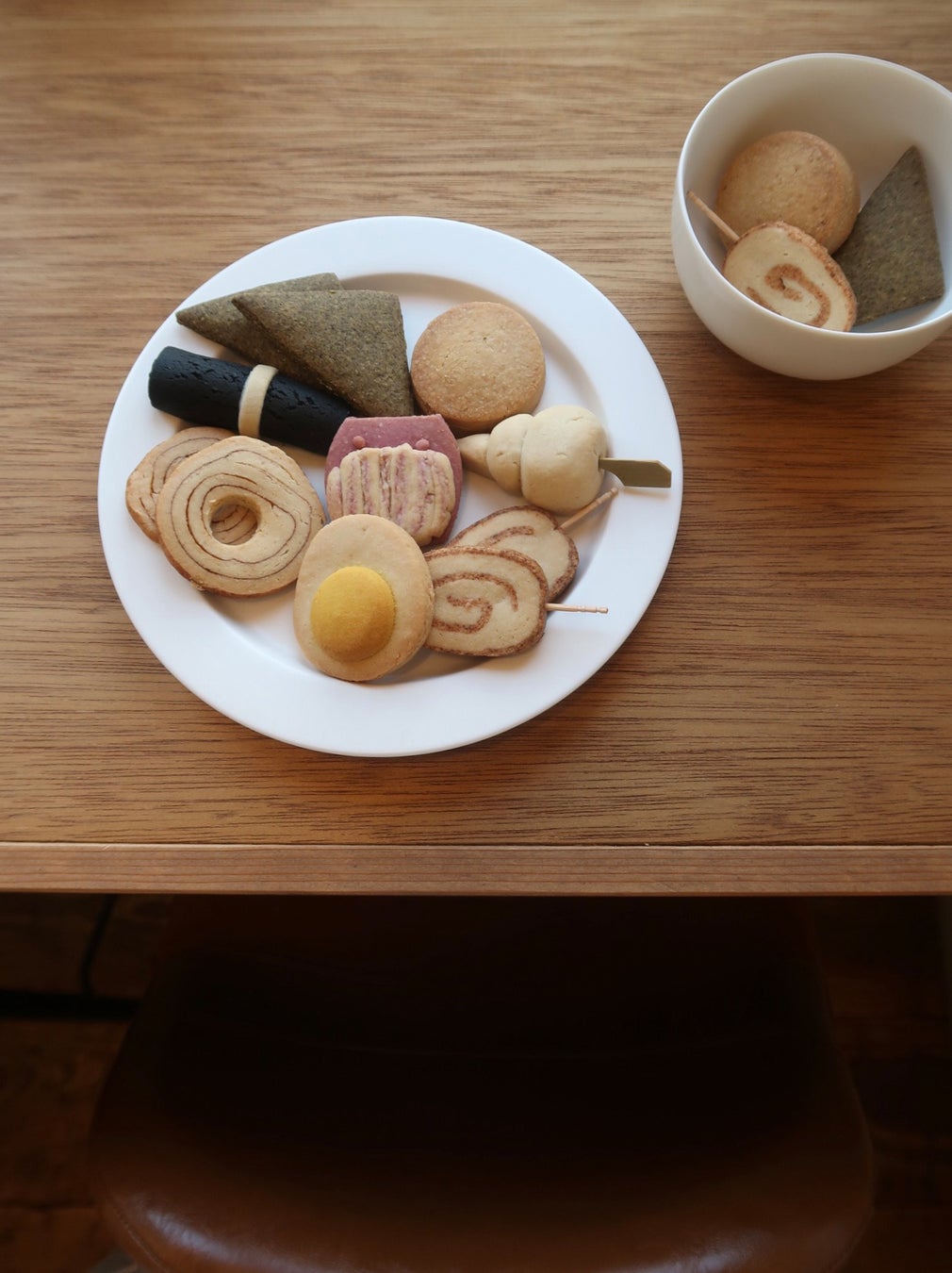 金沢の冬の風物詩“金沢おでん”。昆布巻、かに面、赤巻、梅貝、こんにゃく、たまご、大根、車麩をイメージしてクッキーで表現しました。地元素材にこだわった、目にも舌にも楽しいクッキーです。