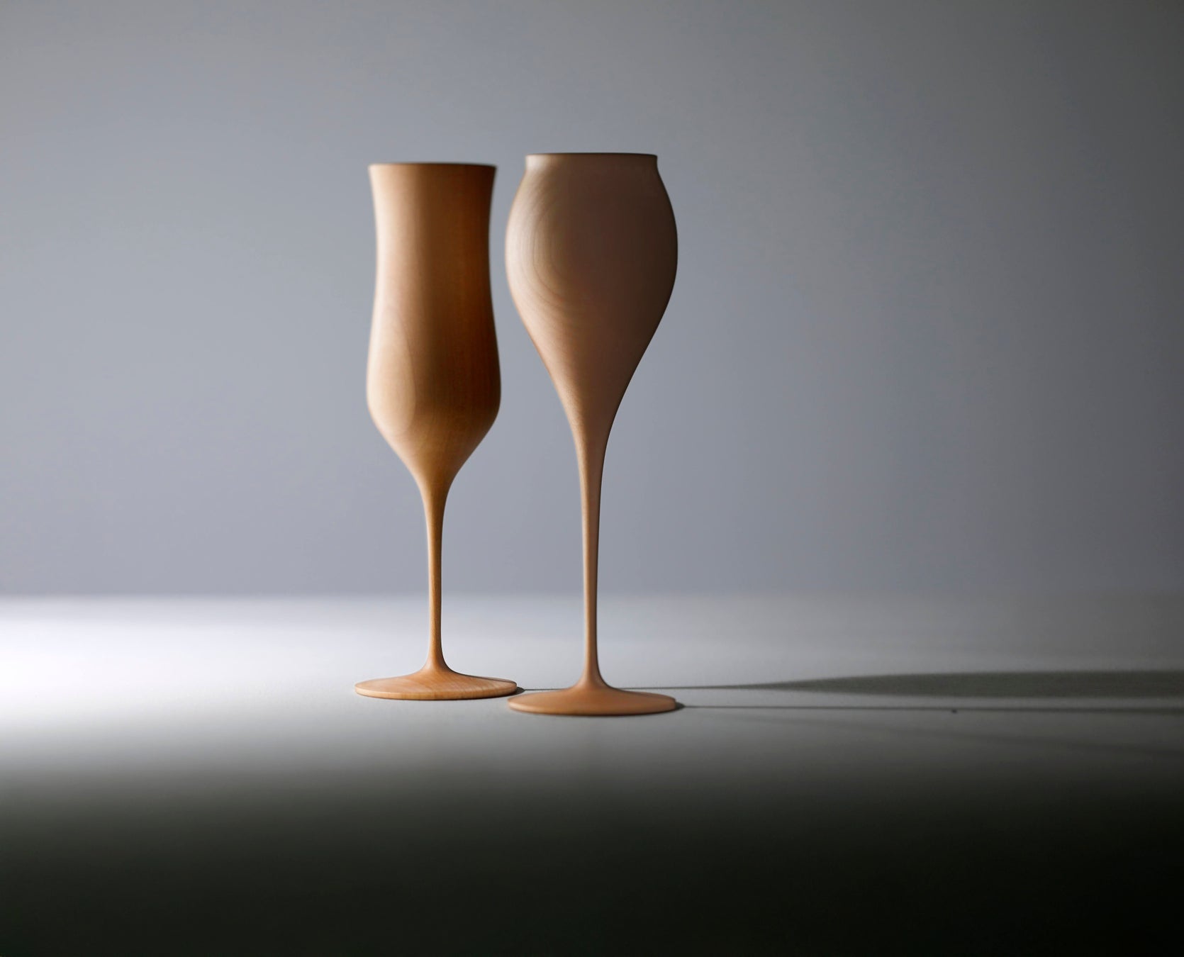 ろくろの町、山中温泉で創業した「我戸幹男商店」。美しく繊細なシルエットに魅了されるカクテルグラスは、木地職人がいくつもの刃物を駆使し、一つひとつ手作業で仕上げています。グラスのほか、椀やカップなども登場します。
