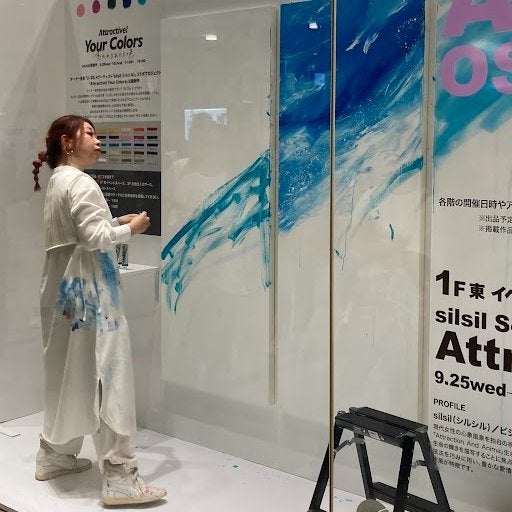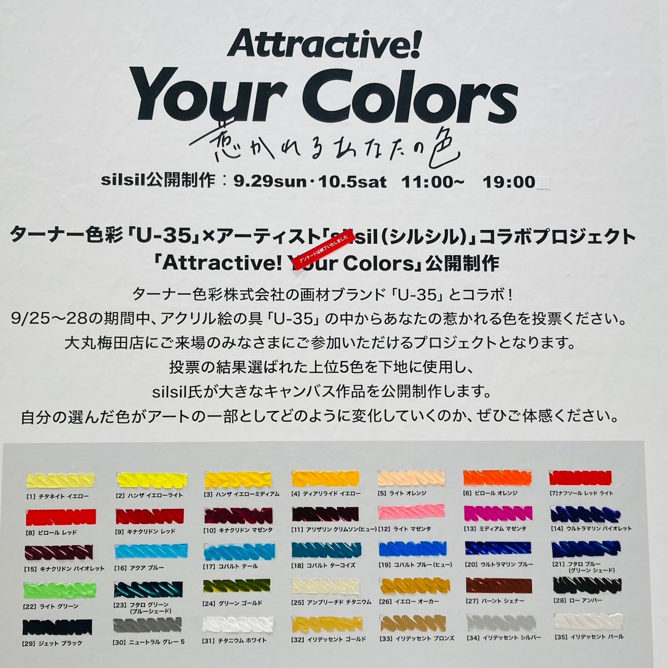 ターナー色彩株式会社の画材ブランド「U-35」とコラボ!9月25日(水)→28日(土)の期間中、アクリル絵具「U-35」の中からあなたが惹かれる色を投票していただきました。投票で選ばれた上位5色を下地に使用し、silsil氏が大きなキャンバス作品を公開制作します。選ばれた色がアートの一部としてどのように変化していくのか、ぜひご体感ください。