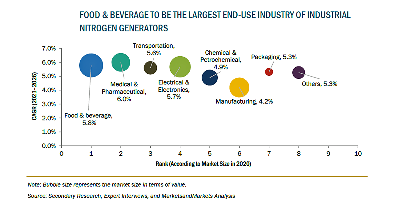 産業用窒素発生装置の市場規模は、2021年の42億米ドルからCAGR5.4%で成長し、2026年には55億米ドルに達すると予測されています。加工食品分野での産業用窒素発生装置の需要拡大が市場を牽引しています。さらに、不衛生で不適切な包装による食品廃棄物の削減に対する意識の高まりも、同市場の成長を牽引しています。食品・飲料、輸送、製薬、製造、包装、石油・ガス、化学、パルプ・製紙などの様々な産業で使用される工業プロセスからの窒素ガス需要の増加や、APAC(アジア太平洋)、中東・アフリカ、南米などの新興国における都市化の進展も市場を牽引する要因となっています。