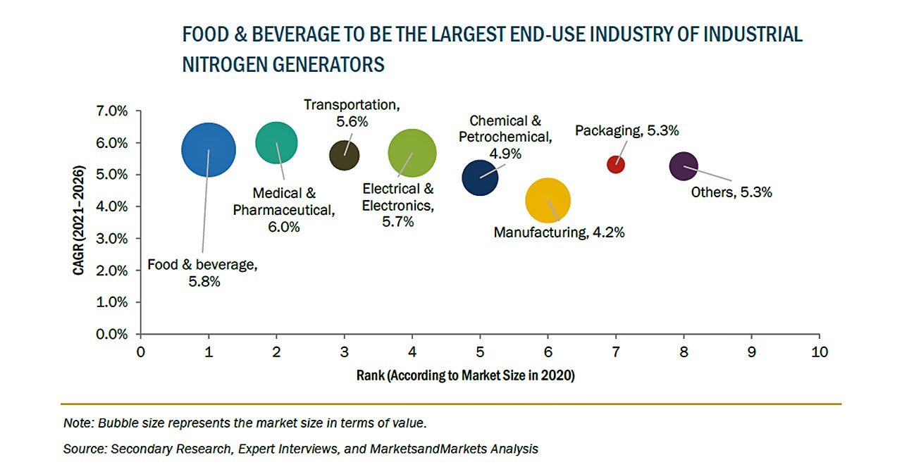 産業用窒素発生装置は、食品・飲料、医療・医薬品、輸送、電気・電子、化学・石油化学などの業界で使用されています。COVID-19パンデミックにより、各分野の産業活動は、サプライチェーンの途絶、需要パターンの変化、その他の緊急措置に対処しなければなりませんでした。この危機的状況下で、収入や設備投資の減少が見られました。今後は、回復力を高めるための長期的な設備投資計画、職場での適切な衛生状態の維持、政府の財政支援、より良いサプライチェーン計画、適切なコミュニケーション、産業活動の再開などの対策により、収益を増加させ、成長を安定させることが期待されています。
