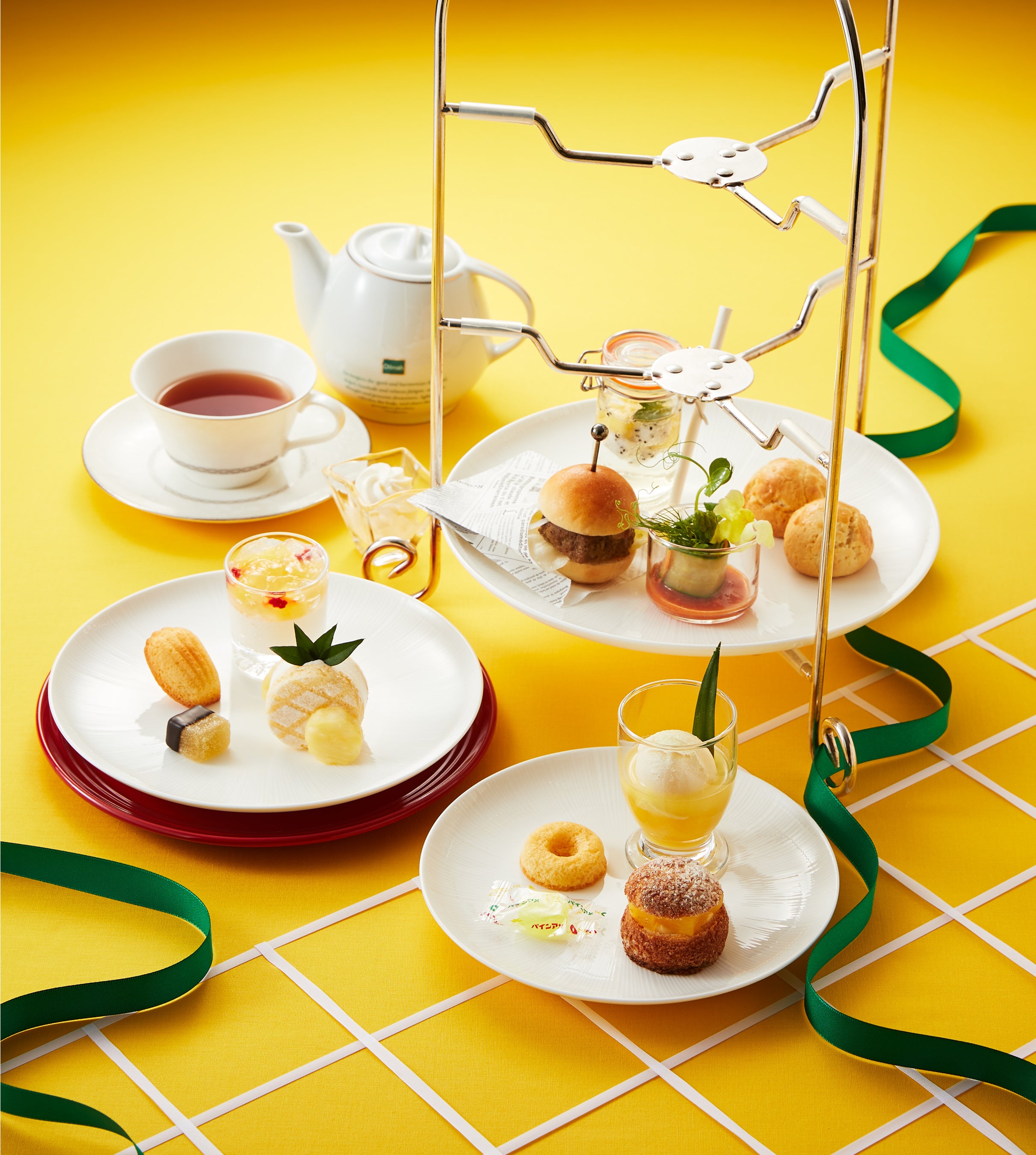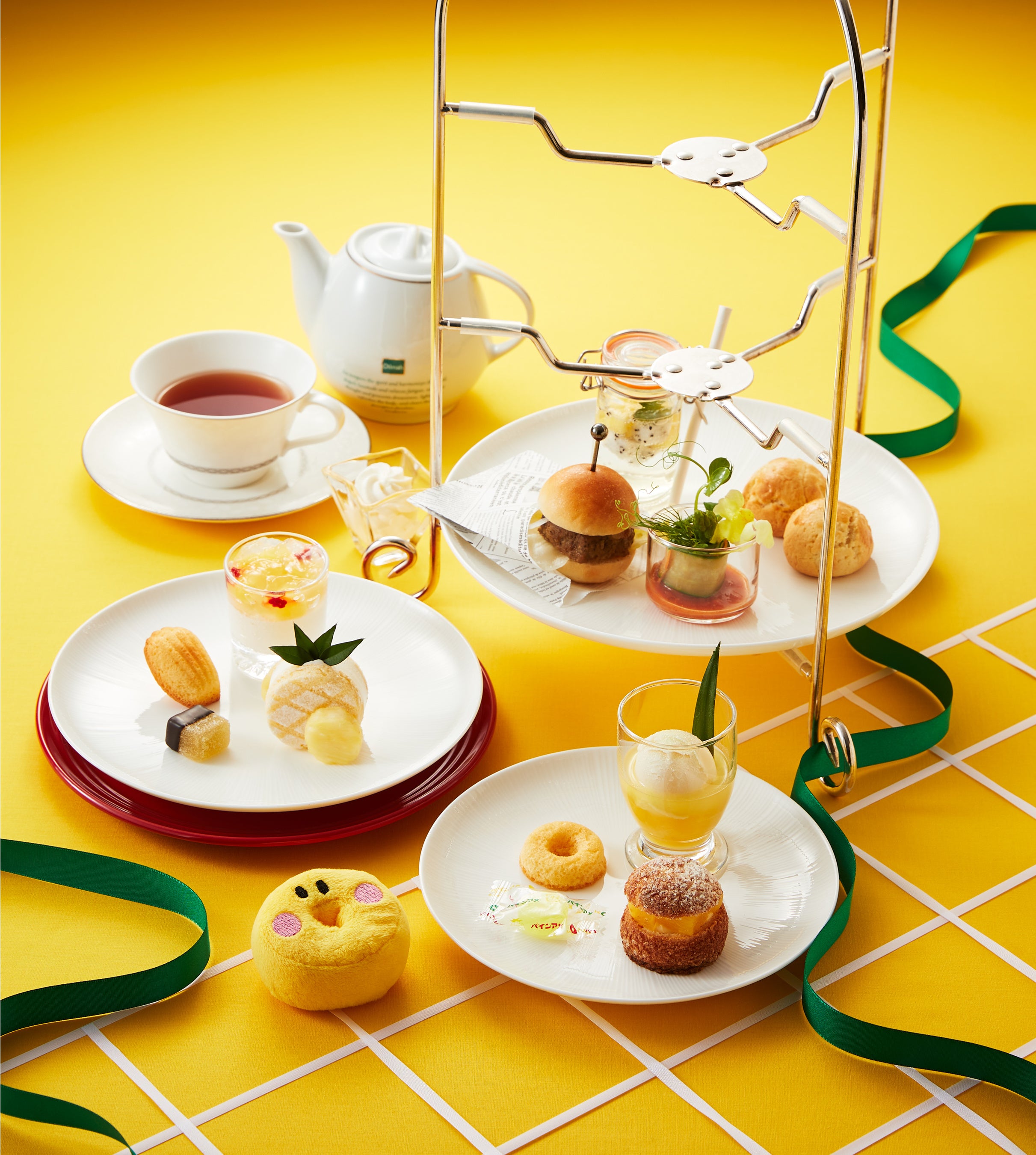 『パインアメアフタヌーンティーセット』は、パインアメ生クリームをサンドした見た目はまるでパイナップルな「パインアメショートケーキ」をはじめとし、シュークリーム、マドレーヌ、パート・ド・フリュイなどのスイーツと、パインアメのコンフィチュールをはさんだ「ポークパテミニバーガー」やサラダなどのセイヴォリーを取り揃えます。