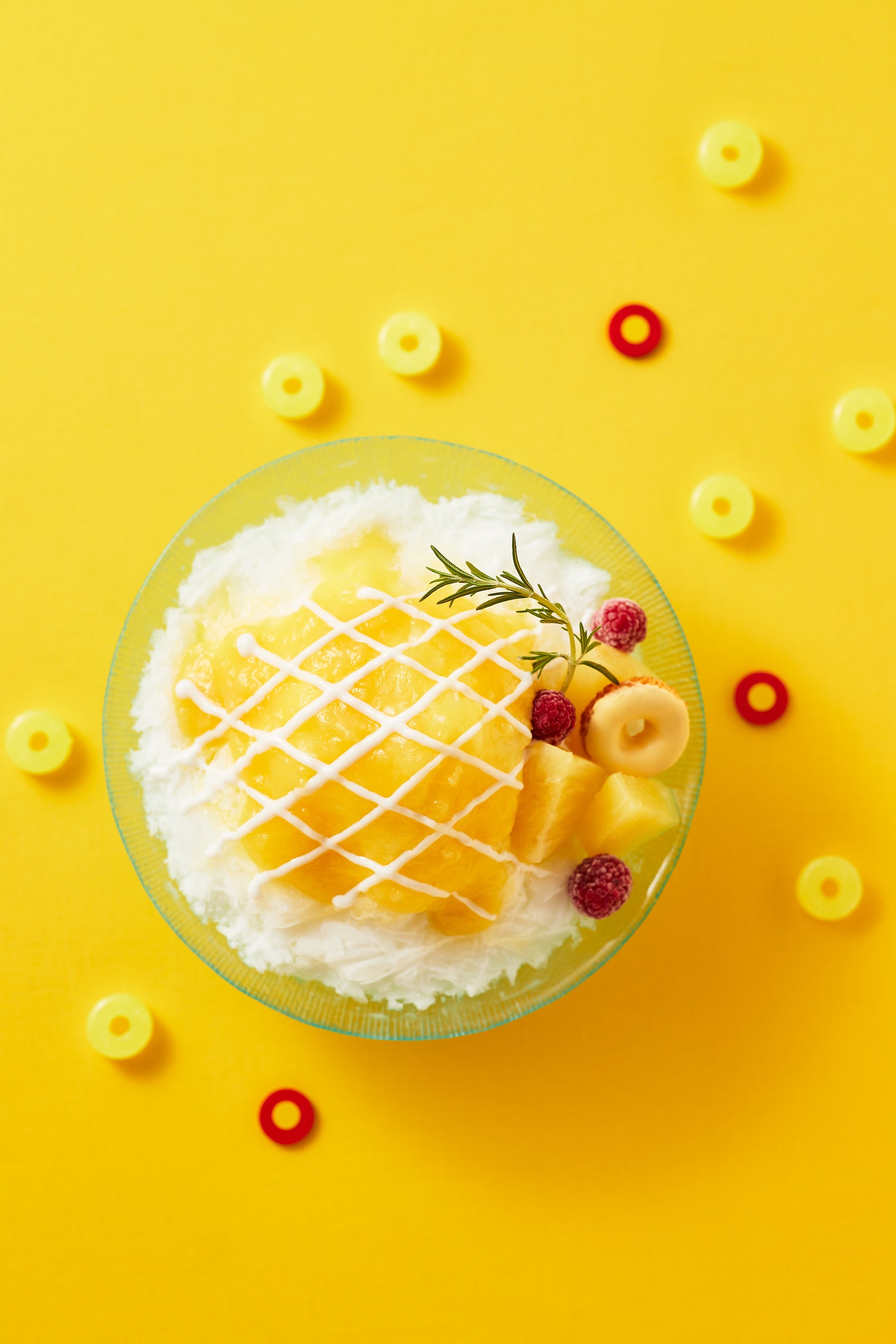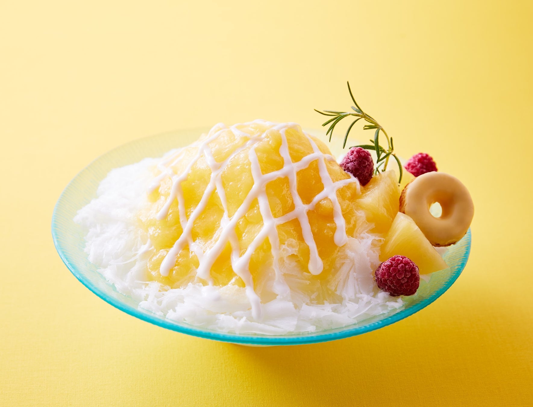 『パインアメ氷』は、ふわふわのミルク氷の中にココナッツアイス、パイナップルキャラメル煮、キャラメルゼリーを潜ませ、パインアメとココナッツの2種類のソースと、パインアメ風味のパイナップルコンポート、パインアメのラスクをトッピングしました。特に8月8日の「パインアメの日」前後にはぜひ味わっていただきたいかき氷です。