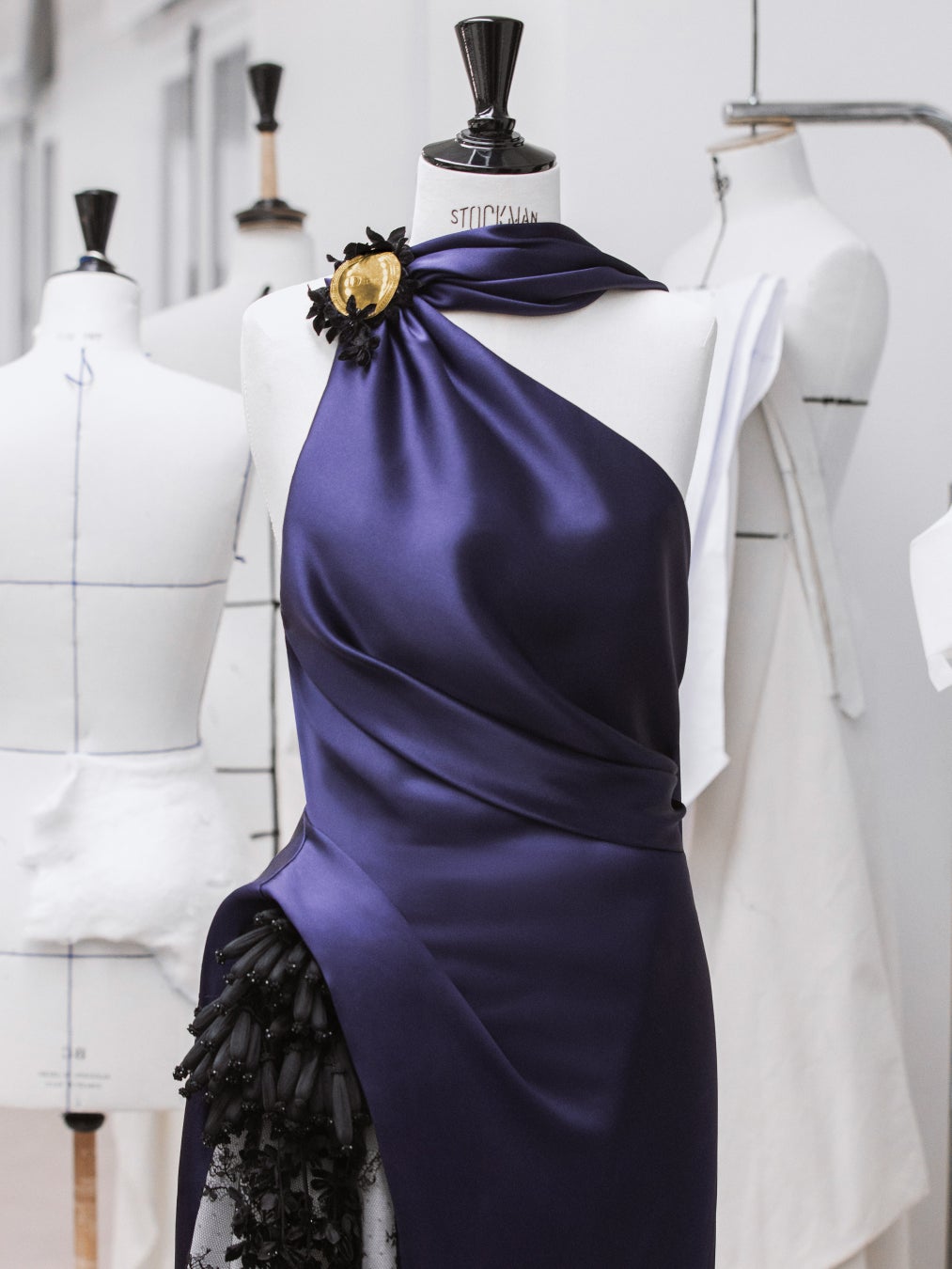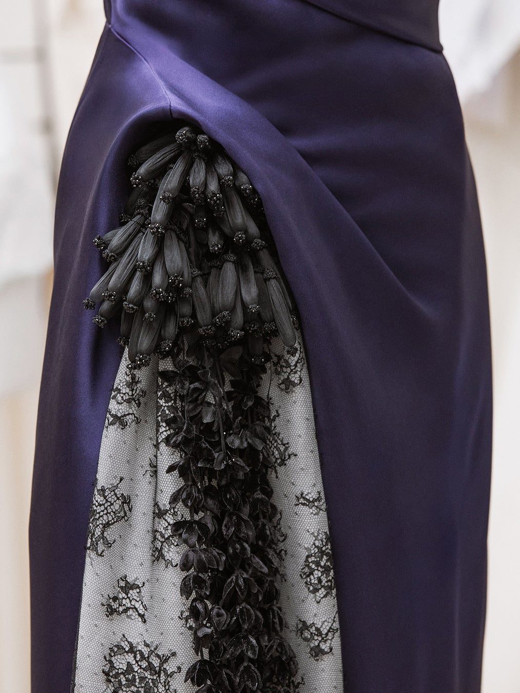 EJAEは、ブラックのレースとチュールをあしらったインディゴサテンドレスを着用しました。ドレスには花房の刺繍と、ディオールの「メダリオン」ブローチがあしらわれています。