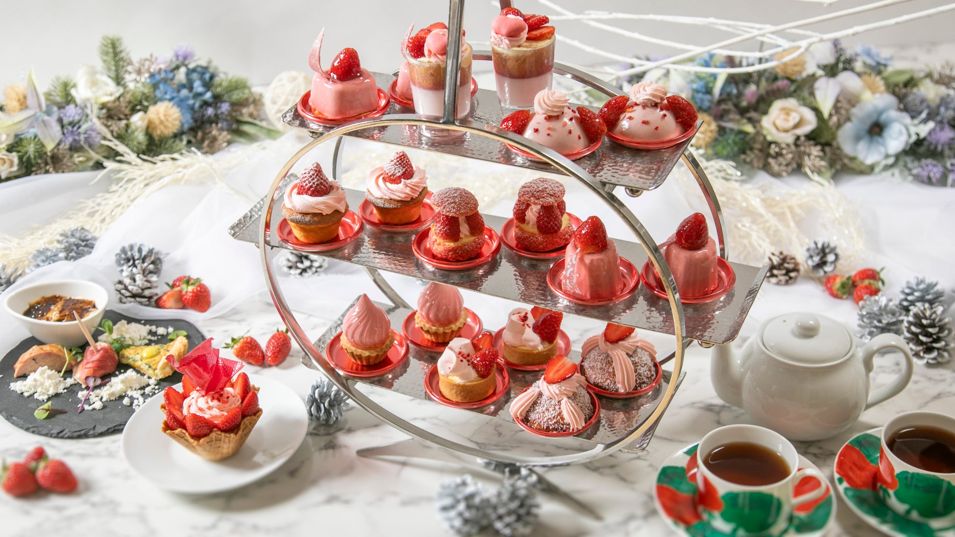 シェフが手掛けるセイボリー(軽食)プレートや、ロンネフェルトの紅茶を始めとするドリンク飲み放題と合わせて、苺の魅力を存分に満喫できるバラエティ豊かなスイーツをお楽しみください。
