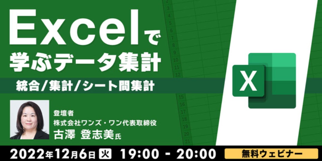 株式会社クリーク・アンド・リバー社(C&R社)は12月6日(火)、日常的にExcelを使用し多くのデータを扱っている方を対象に、無料のオンラインセミナー「Excelで学ぶデータ集計~統合・集計・シート間集計~」を開催いたします。
