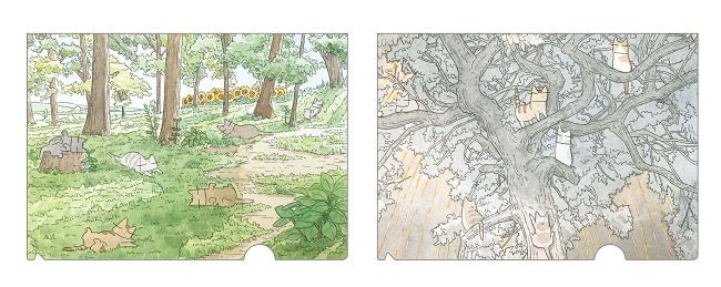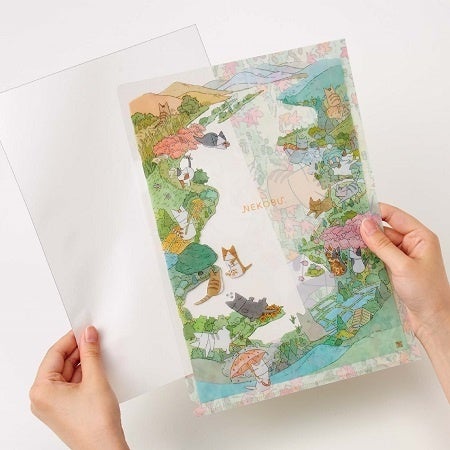 ファイル裏面には、12ヵ月を通して猫が巡る、里山の湖畔のイラストがデザインされています。湖の部分はクリアになっているので、中に入っている書類が確認しやすいのも便利です。