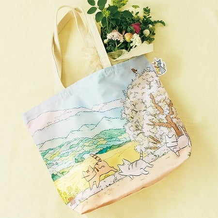 情緒たっぷりに描かれた日本の原風景に遊ぶ猫と季節の花の絵をプリントしたトートバッグです。