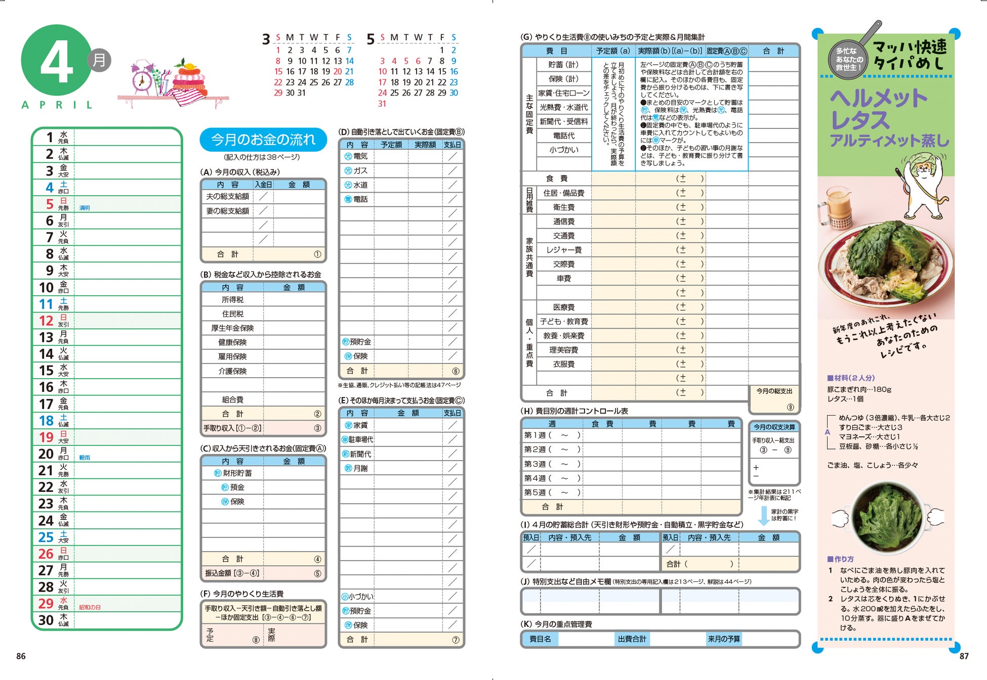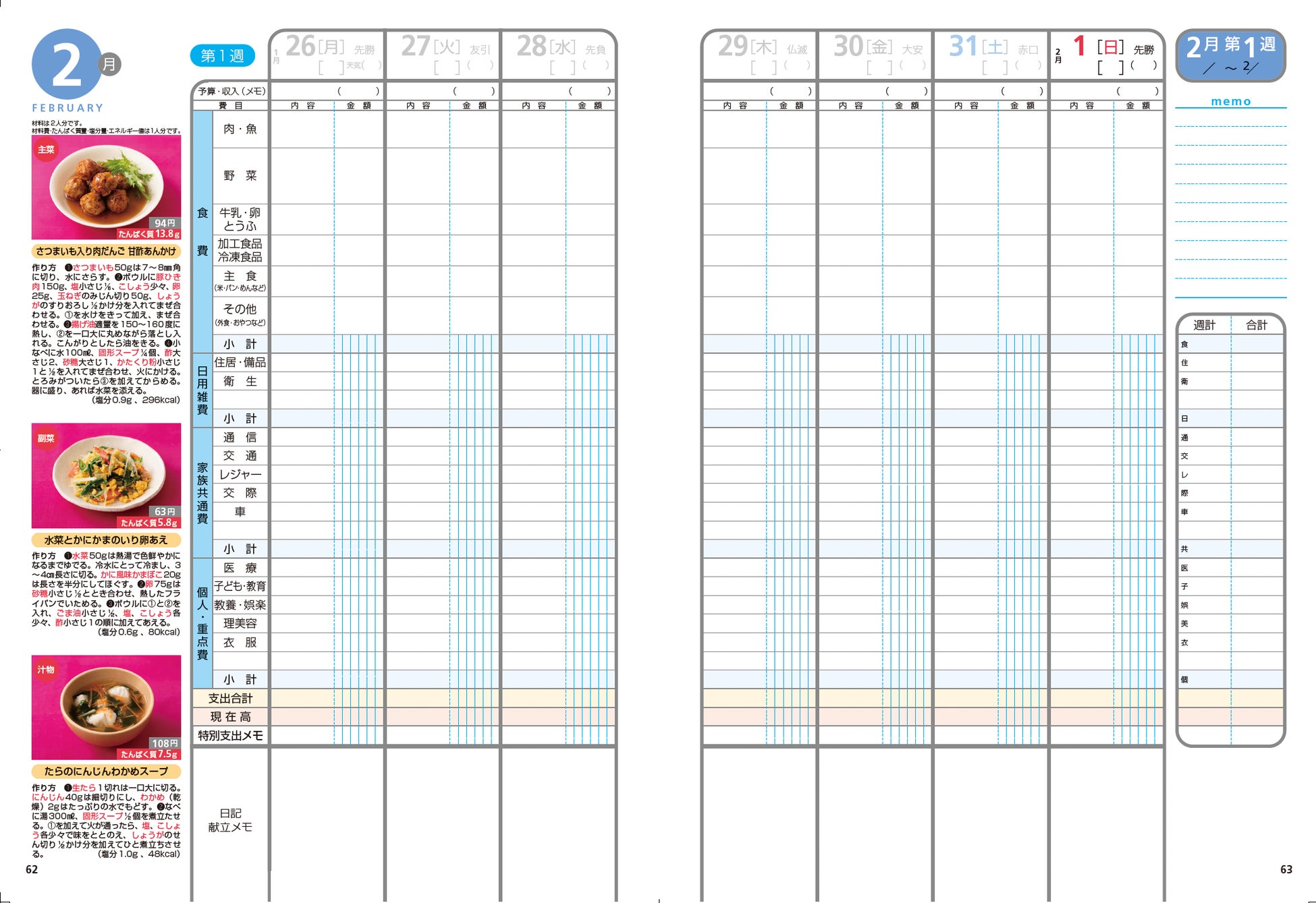 家計簿は費目入りで手間いらず。毎日記入できる日記&献立メモスペースが人気です。