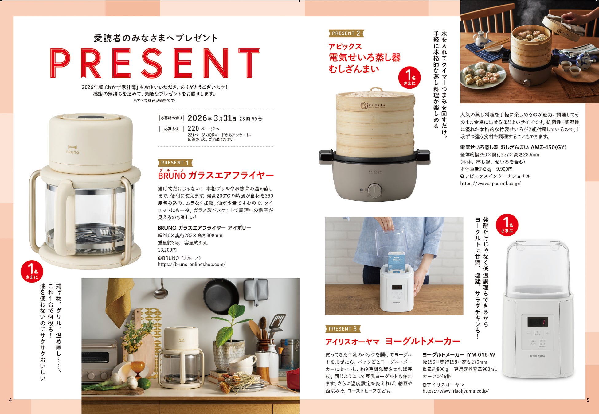 大人気「BRUNO ガラスエアフライヤー」、アピックスの「電気せいろ蒸し器 むしざんまい」ほかを抽選でプレゼント!