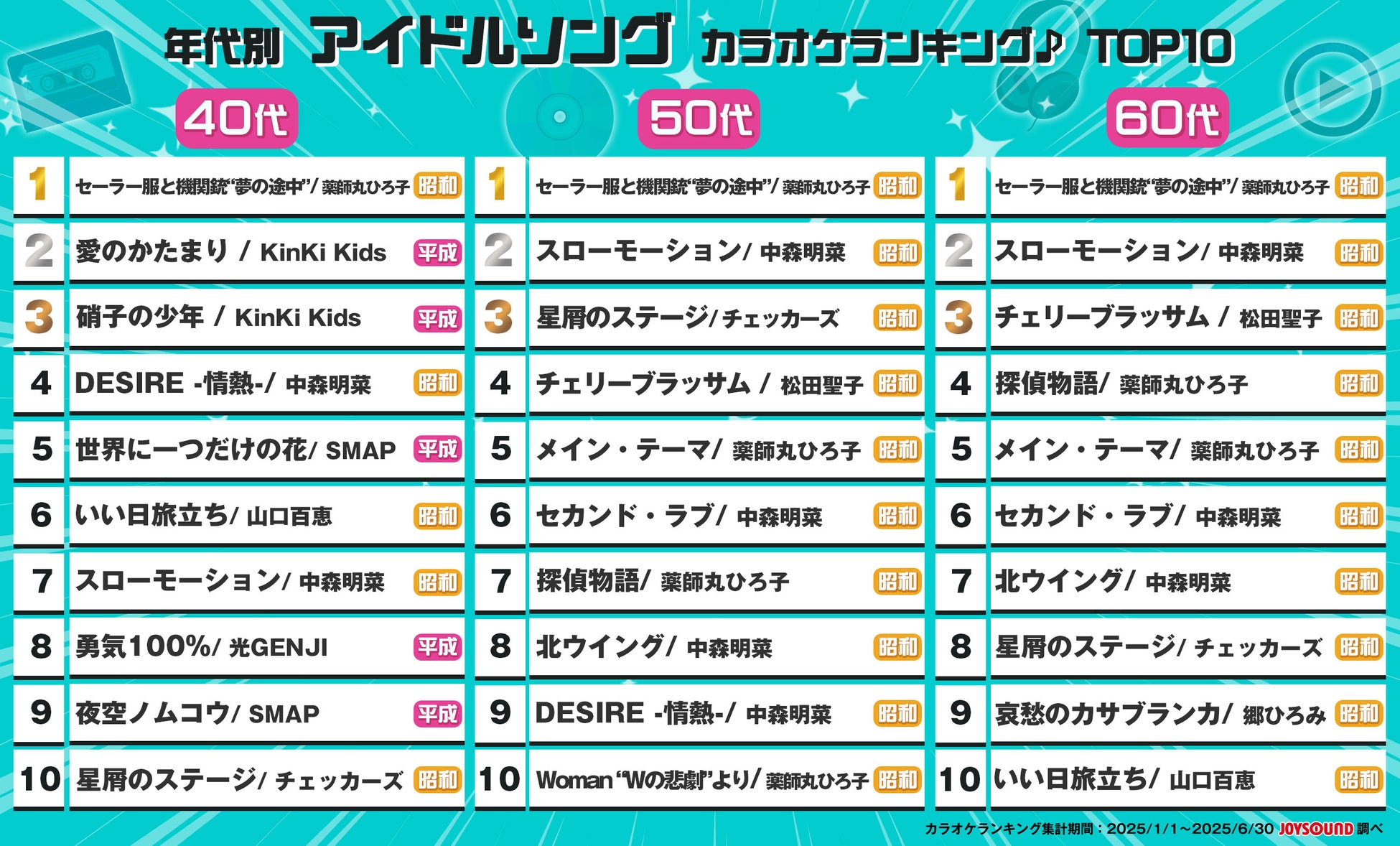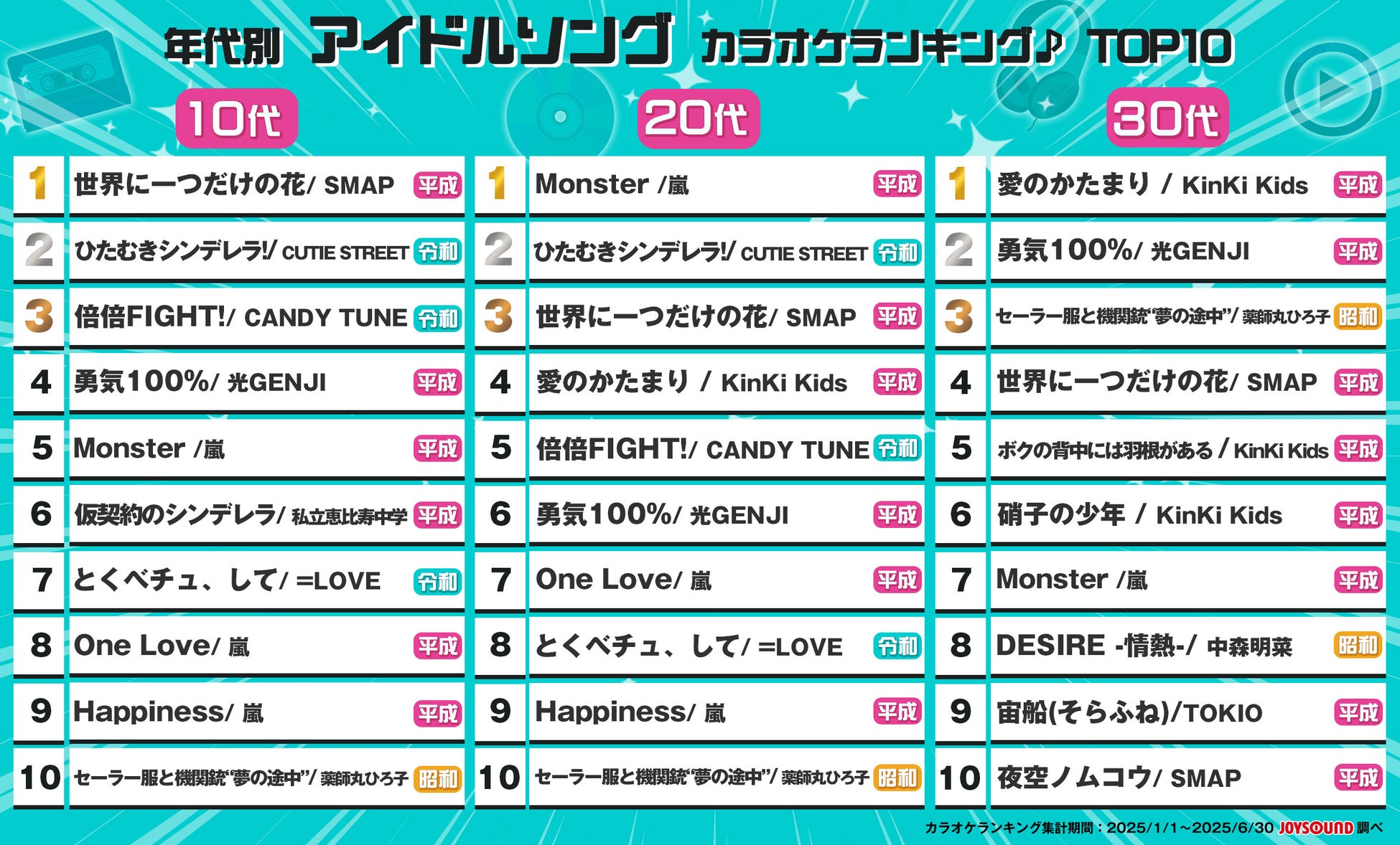 令和のアイドルソングを抑えて首位を獲得したのはSMAP「世界に一つだけの花」。続いてCUTIE STREET「ひたむきシンデレラ!」、CANDY TUNE「倍倍FIGHT!」が上位にランクイン!光GENJI「勇気100%」は4位、嵐も複数曲が入り高い支持を獲得。昭和から唯一TOP10入りした薬師丸ひろ子「セーラー服と機関銃“夢の途中”」は、物語性ある歌詞と歌いやすさから、カラオケ採点でも人気の1曲となっており、全年代で上位にランクインを果たしています。