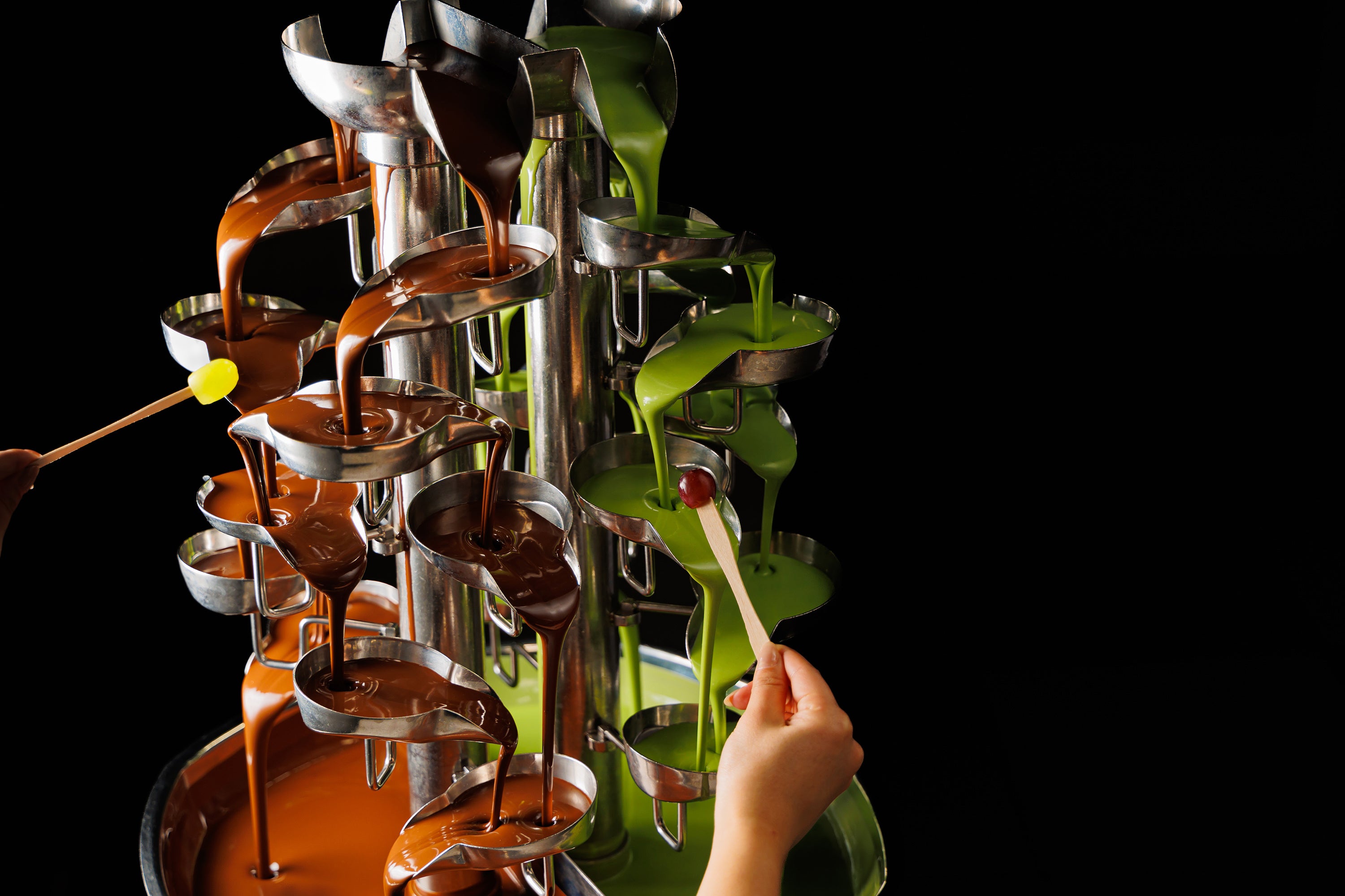 デザートコーナーで楽しめるチョコレートファウンテン。季節ごとに内容を変えて提供いたします。