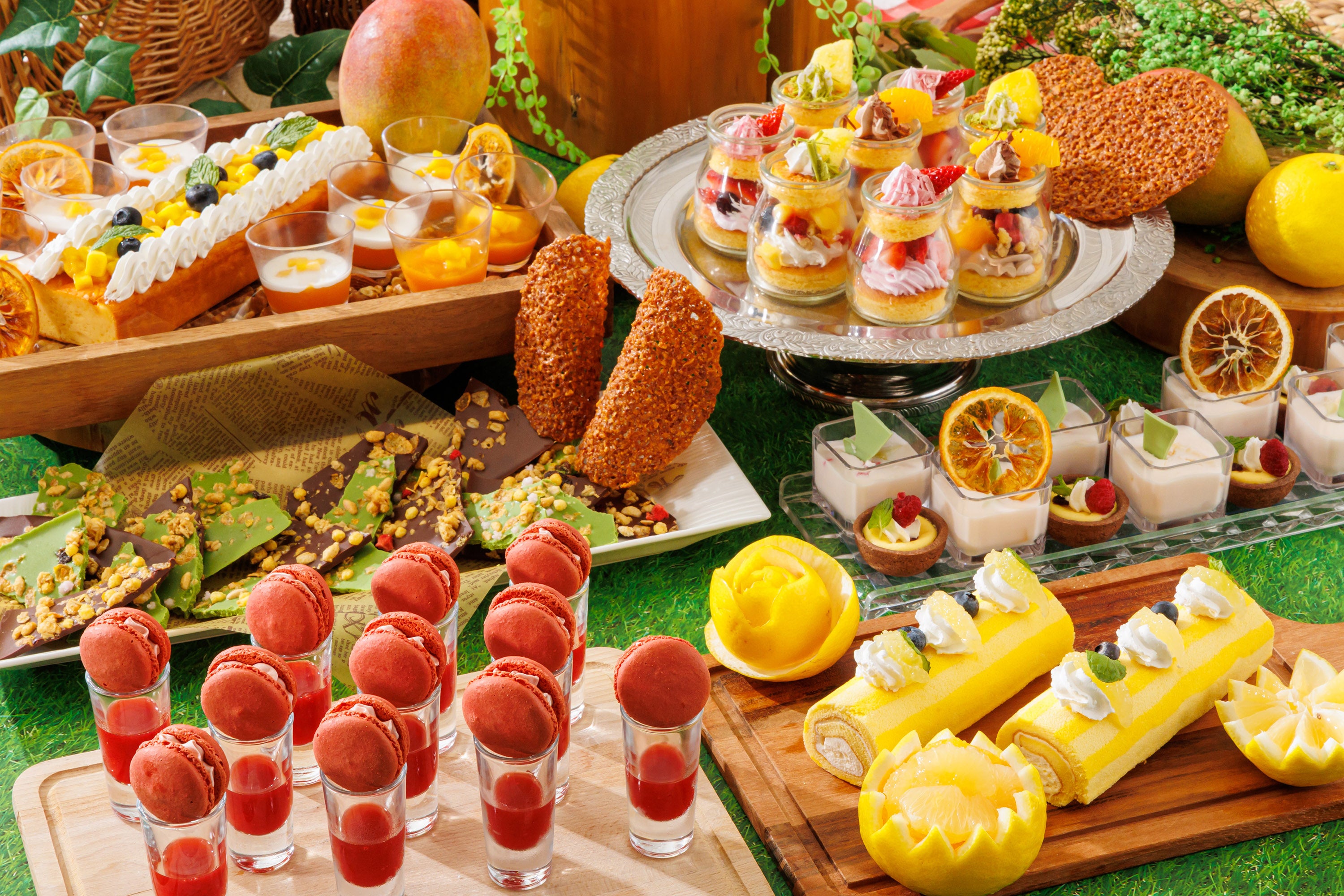 フルーツトライフル/ミルクフルーツゼリー/チーズタルト/日向夏のロールケーキ/マカロンチーズクリームサンド/マンゴープリン/マンゴーヨーグルトケーキ など