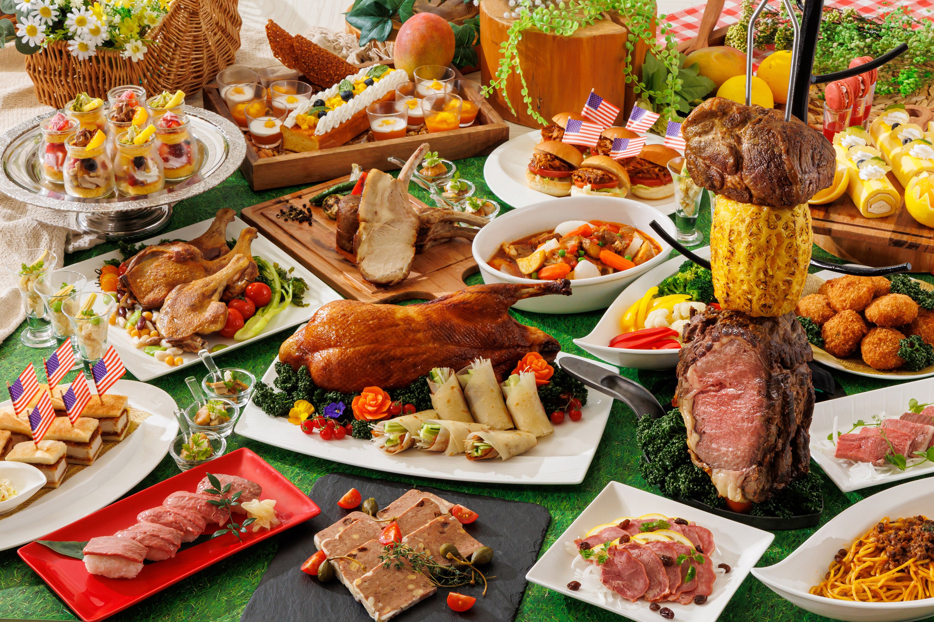 シュラスコとはブラジリアンバーベキュー。本場ブラジルのシュラスコを、ハワイをモチーフにしたレストラン「アーカラ」では、ハワイアンシュラスコとしてアレンジしたおすすめ料理としてご提供いたします。開放的でライブ感あふれるオープンキッチンから、豪快に切り出される牛肉と神戸ポークのテイストをお楽しみいただけます。また和食コーナーにはローストビーフの握り寿司やローストビーフ丼、中華コーナーには北京ダックなど、世界を代表するような“肉”料理の数々をご堪能ください。
