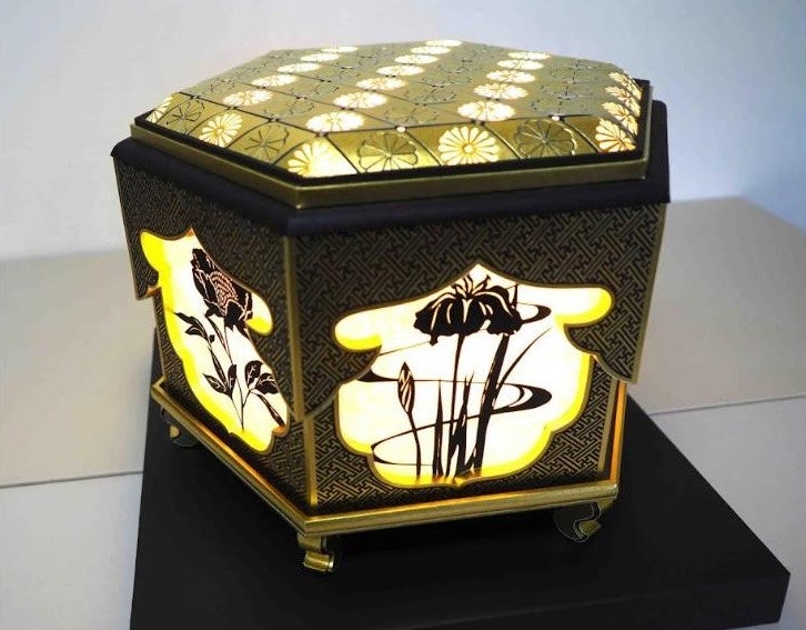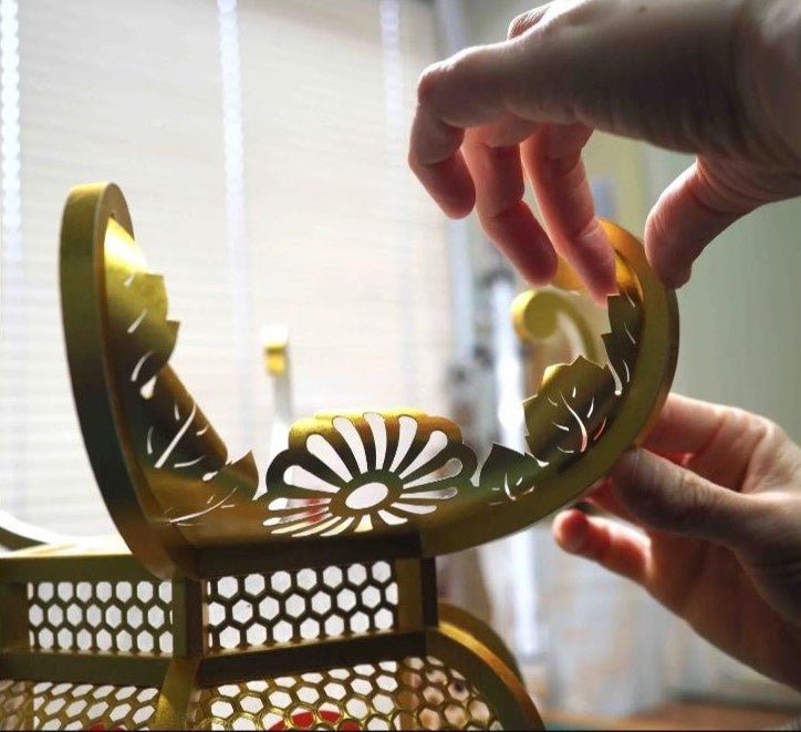 木や金具は一切使わず和紙と少量の糊だけで立体的に組み上げます。 曲線部分はのりしろが無く和紙の厚みだけで貼り合わせる。