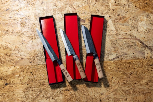 写真左から柳刃包丁210㎜、薩摩包丁165㎜、三徳包丁165㎜。野菜や肉、魚など、全般に使用できる万能包丁。切れ味と耐久性に優れ、手入れをしながら末永く愛用することができます。包丁だけで20種類以上あり、アジ切包丁やうなぎ専用包丁なども製作しています。