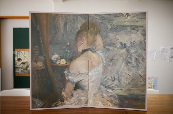印象派の画家ベルト・モリゾの『トイレの女』を二曲屏風に。著作権が消滅したパブリックドメインの名画などを、大型プリンターでプリントした見本です。使用する越前和紙は精細な奥行きが出ます。手軽に持ち運びができる伝統的な屏風を、現代の生活空間に取り入れやすくするアイデアです。