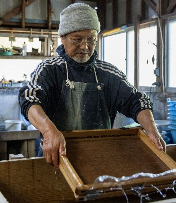 金刺さんは、妻・宏子さんと共に和綿や藍、楮(こうぞ)といった、作品作りに欠かせない素材から自分たちで栽培。それぞれの植物の魅力を引き出す作品を制作しています。「良い素材を使えば良い物ができるのは当たり前。足元に見捨てられている素材に魂を吹き込め」という、水俣病を題材にした小説を描いた作家・水上勉氏の言葉に影響を受け、竹やい草など紙漉きに不向きな素材にも挑戦しています。また、日本の紙漉きの技術を世界に広めるために、ブラジルやウズベキスタンなどへの技術普及にも尽力。「作る度に新しい発見があり、進化がある。熊本の紙文化が途絶えないよう、やり続けていく」と、夫婦共に魂のこもった作品作りを続けています。