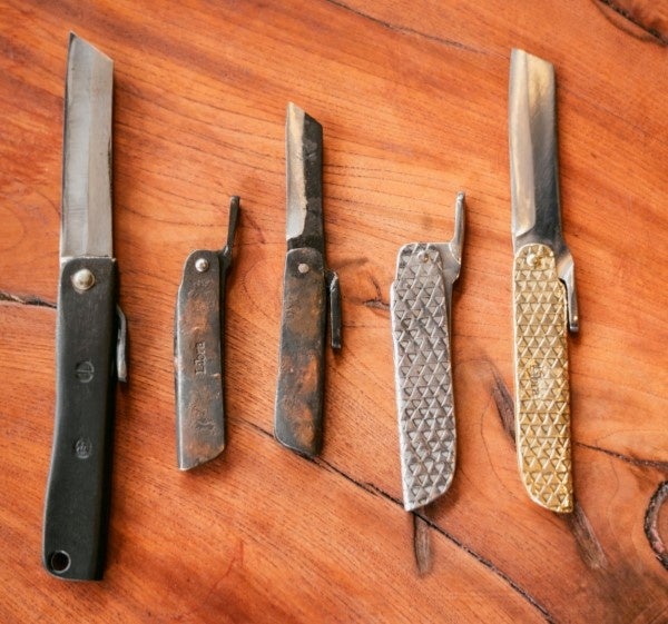 ロートアイアンの技術とアイデアで、伝統的な肥後守型小刀をステーショナリーナイフにアレンジ。黒打ちの肥後守(写真左端)、柄の表面に真鍮や銅を溶着させたもの(写真左から2本目、3本目)や、ステンレスにエンボス加工(写真右から1本目、2本目)を施したものなど、目にも楽しい「Libra」の刻印が映える一品です。
