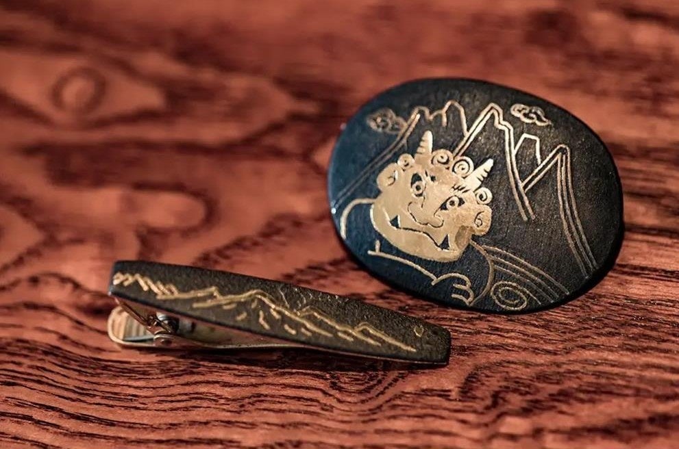 郷土に伝わる伝承や物語、生き物などで熊本らしさを表現。根子岳にまつわる民話に着想を得て制作したブローチと、阿蘇五岳の涅槃像を描いたネクタイピンは、いずれも地金にどっしりと厚みを持たせているのが特徴で、さりげなさの中でも存在感が際立ちます。