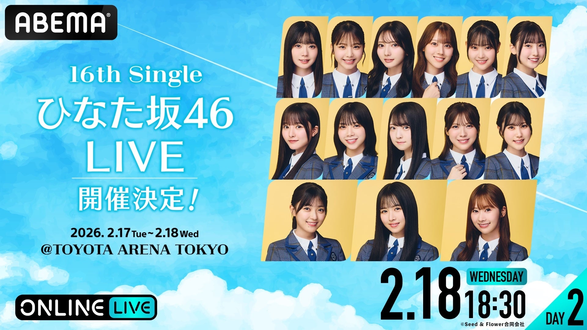 新しい未来のテレビ「ABEMA」は、「ABEMA PPV」にて日向坂46 『16th Single ひなた坂46 LIVE』の模様を、2026年2月17日(火)・18日(水)の2日間にわたり、18時30分より生放送することを決定いたしました。また、本ライブのチケットを2月12日(木)12時より発売開始いたします。