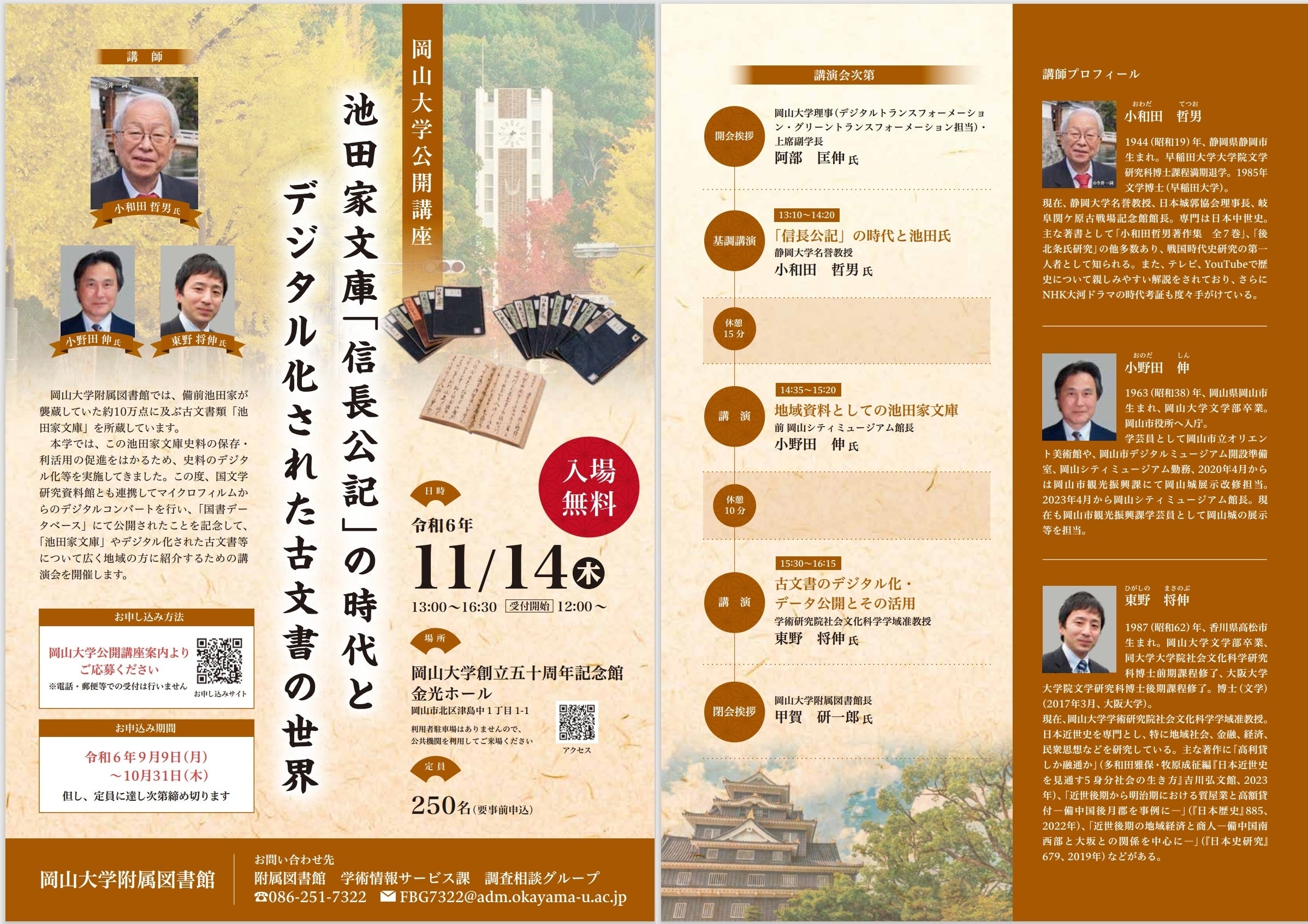 【岡山大学】岡山大学公開講座「池田家文庫『信長公記』の時代とデジタル化された古文書の世界」を開催しました