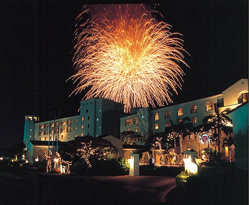 夜空を鮮やかに彩る大輪の打ち上げ花火を、プールサイドやビーチからご覧いただけます。