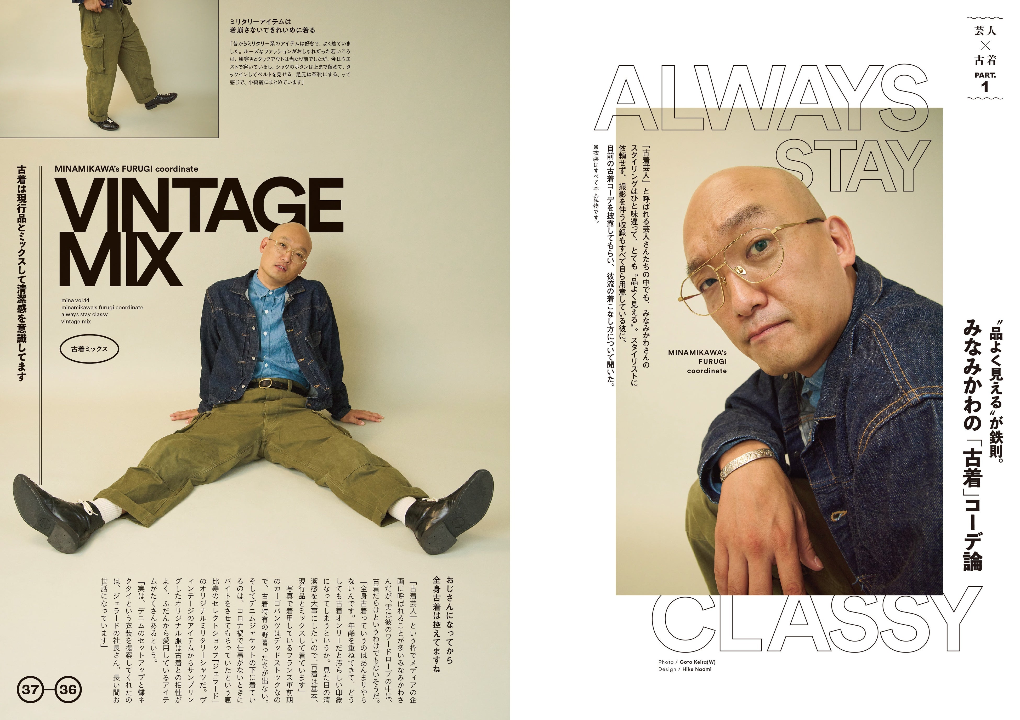 ファッション&ライフスタイル誌「mina」の人気コンテンツである「古着」「インテリア」「グルメ」「メイク」などの企画を芸人さん58名がジャック。いつものminaより、ちょっとニッチでがっつり深くてしっかりおもしろい内容になりました!若手芸人さんが多数登場するファッションスナップも必見!