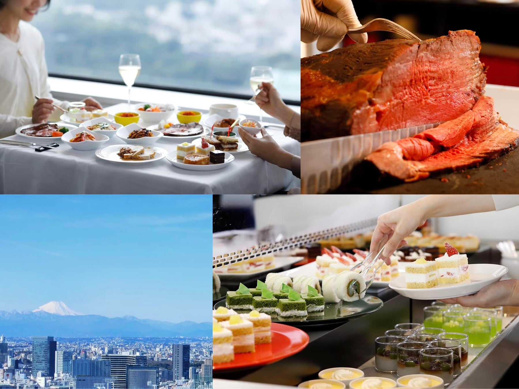 ローストビーフをはじめとするホテル王道料理や“スーパーシリーズ”のスイーツに加え、大豆ミートや豆乳など、健康・環境にも配慮した植物由来の素材を使用した“美味と健康”をテーマとしたメニューをラインアップ。ホテル最上階から望む東京の絶景とともにお愉しみいただけます。