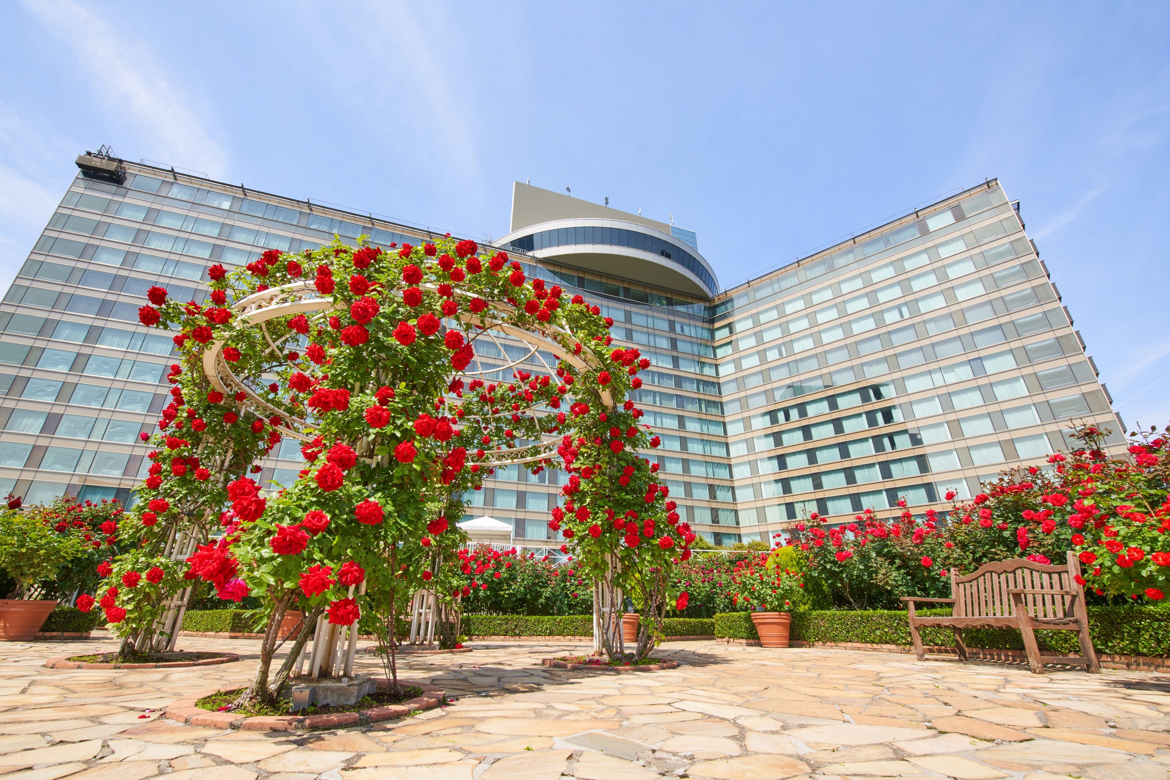 ホテルニューオータニ(東京)のレッドローズガーデンは、フローラルデコレーター ケネス・ターナー氏監修のもと、2000年11月に屋上緑化の一環として誕生しました。春と秋の年2回、30種3万輪もの赤薔薇が咲き誇る景色は圧巻の美しさで、まさに現在見頃を迎えております。春薔薇の特徴は、花の大きさと色の鮮やかさ。まるでカーテンのようなつる薔薇も開花し、レッドローズガーデン全体を華やかに彩ります。