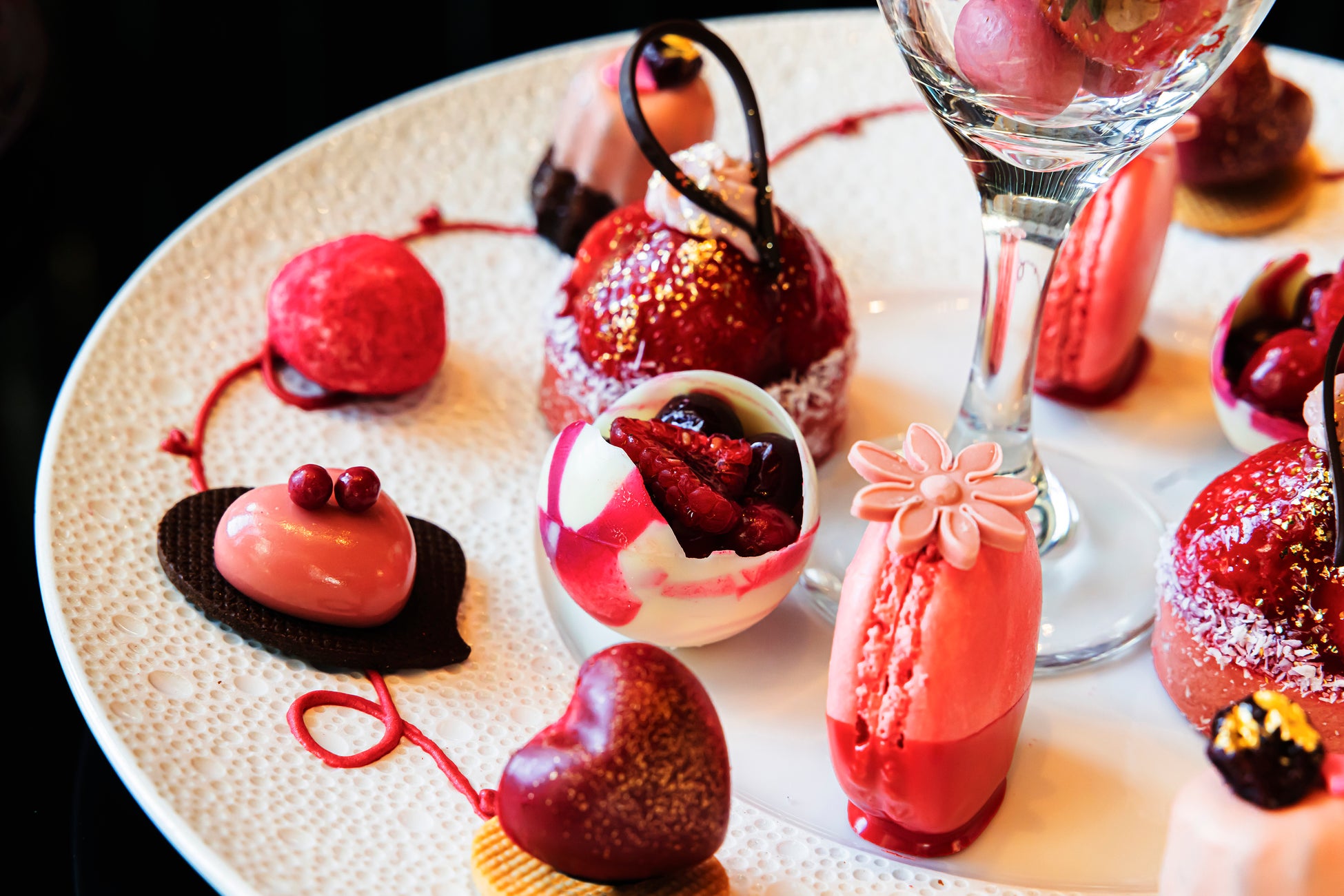 スイーツプレートはココアクッキーの上にのせたルビーショコラムースや、ラズベリーとストロベリーの味わいにローズの香りを加えたフィナンシェなどハートやピンクのスイーツを周りに並べ、中央には輝くタルトフレーズやベリーティラミス、フレッシュなストロベリーで愛が実る様子を表現。セイボリープレートには、スモークサーモン&アボカドクリーム、ビーツ風味のたまご&ハムのサンドウィッチのほか、パプリカのフムスを加えたビーツタルトやストロベリーと共に味わえるカプレーゼとトマトのムースをご用意しました。ハートのストロベリーを飾ったグラススイーツは、パイ生地やナッツの食感とカスタードのクリーミーさにラズベリーのソースで甘酸っぱさを加えたミルフィーユ ヴェリーヌをお楽しみいただけます。