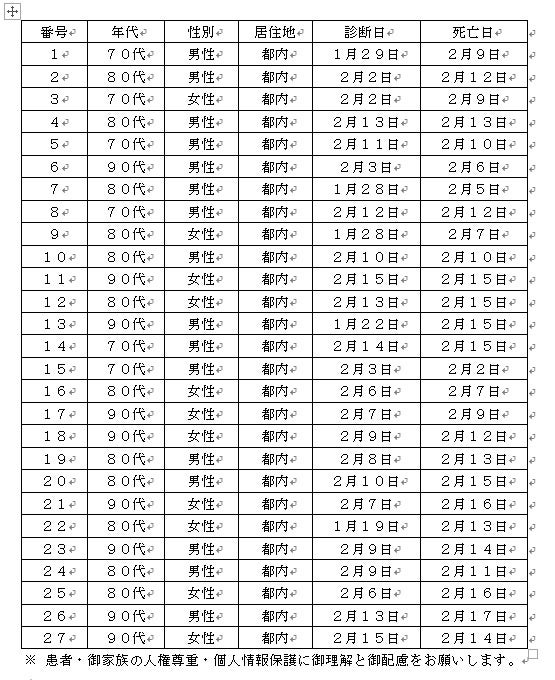 都内で新型コロナウイルスに感染した方が死亡されましたのでお知らせします。お亡くなりになった方のご冥福をお祈り申し上げます。