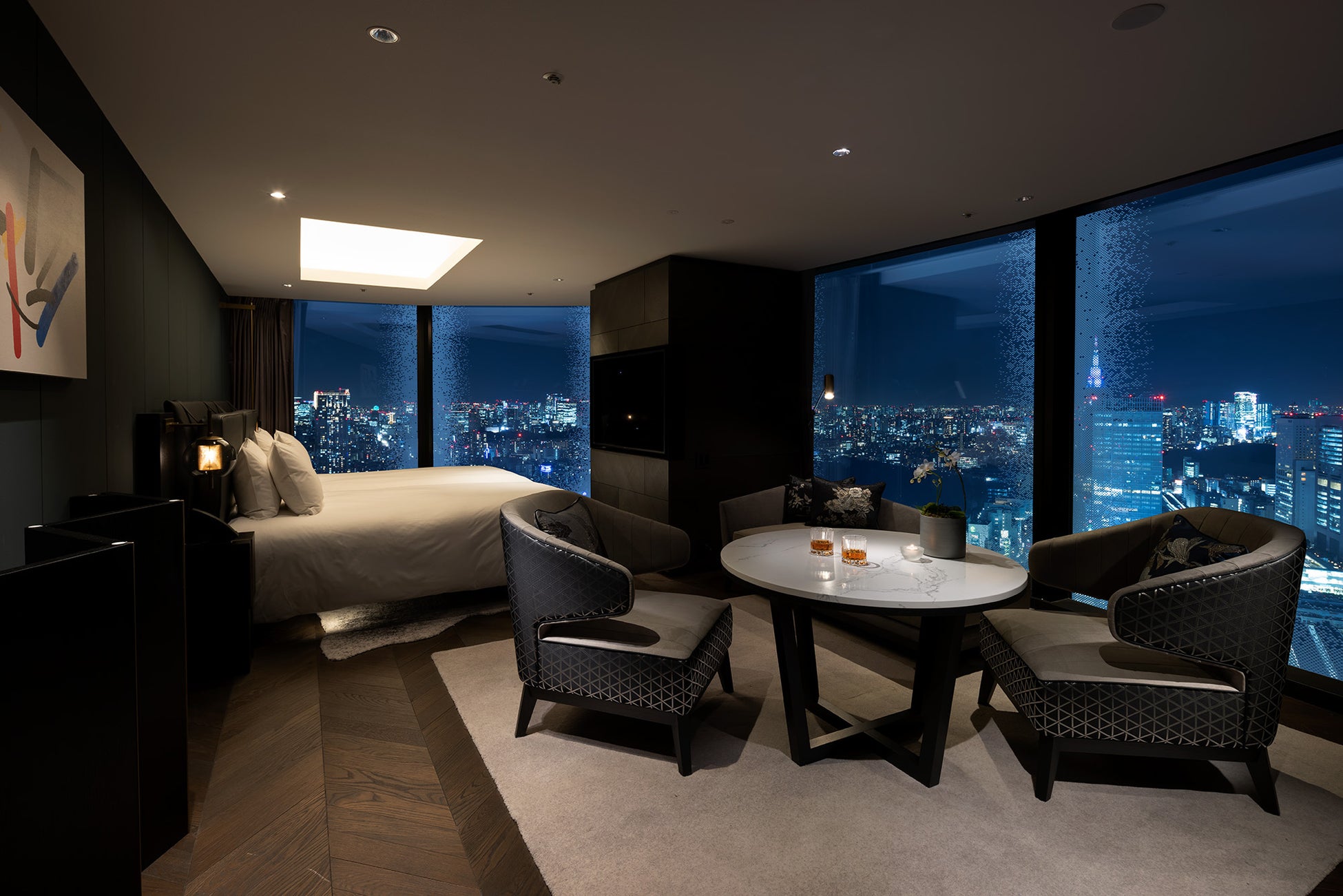 BELLUSTAR TOKYO, A Pan Pacific Hotelは、地上の喧騒から離れ特別な空間を楽しむ都会のラグジュアリーホテルです。客室数は全97室で39~44階に位置する客室は、日本の伝統文化を織り交ぜたインテリアと幅約7mの窓から眼下に東京を一望できる抜群の眺望が特徴です。45~47階のホテル最上部には最大277㎡の広さを含む計5室の特別な空間であるペントハウスを有し、高さ200mに位置する3層吹き抜けの圧倒的な空間が特徴のレストラン&バーは全4店舗をラインナップ、心身を深い安らぎで満たす至極のリラクゼーションが魅力の天空のスパを兼ね備え、「天空のプライベートヴィラ」として最上のエクスペリエンスを提供いたします。