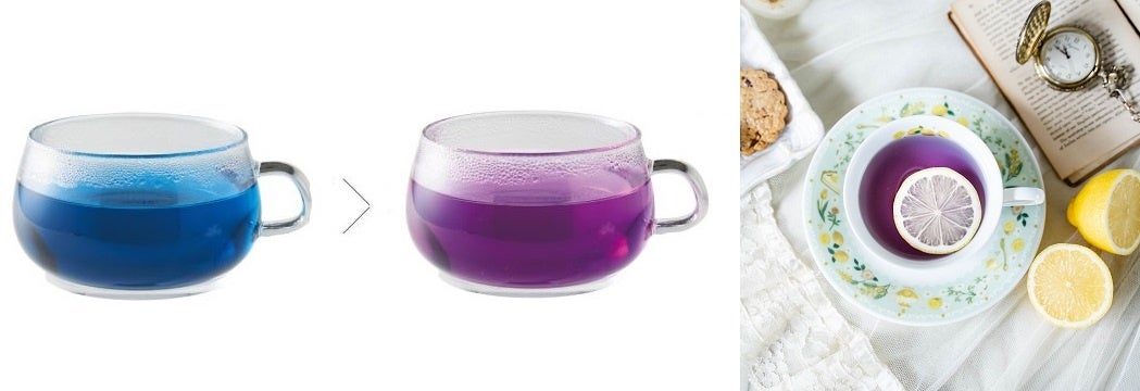 鮮やかな青色のお茶は、柑橘系の果汁を垂らすと紫色にみるみる変化、魔法のような瞬間が楽しめるティータイムに。色の変わるお茶の正体は、バタフライピーというハーブで、レモングラスをブレンドしたさわやかな味わいです。