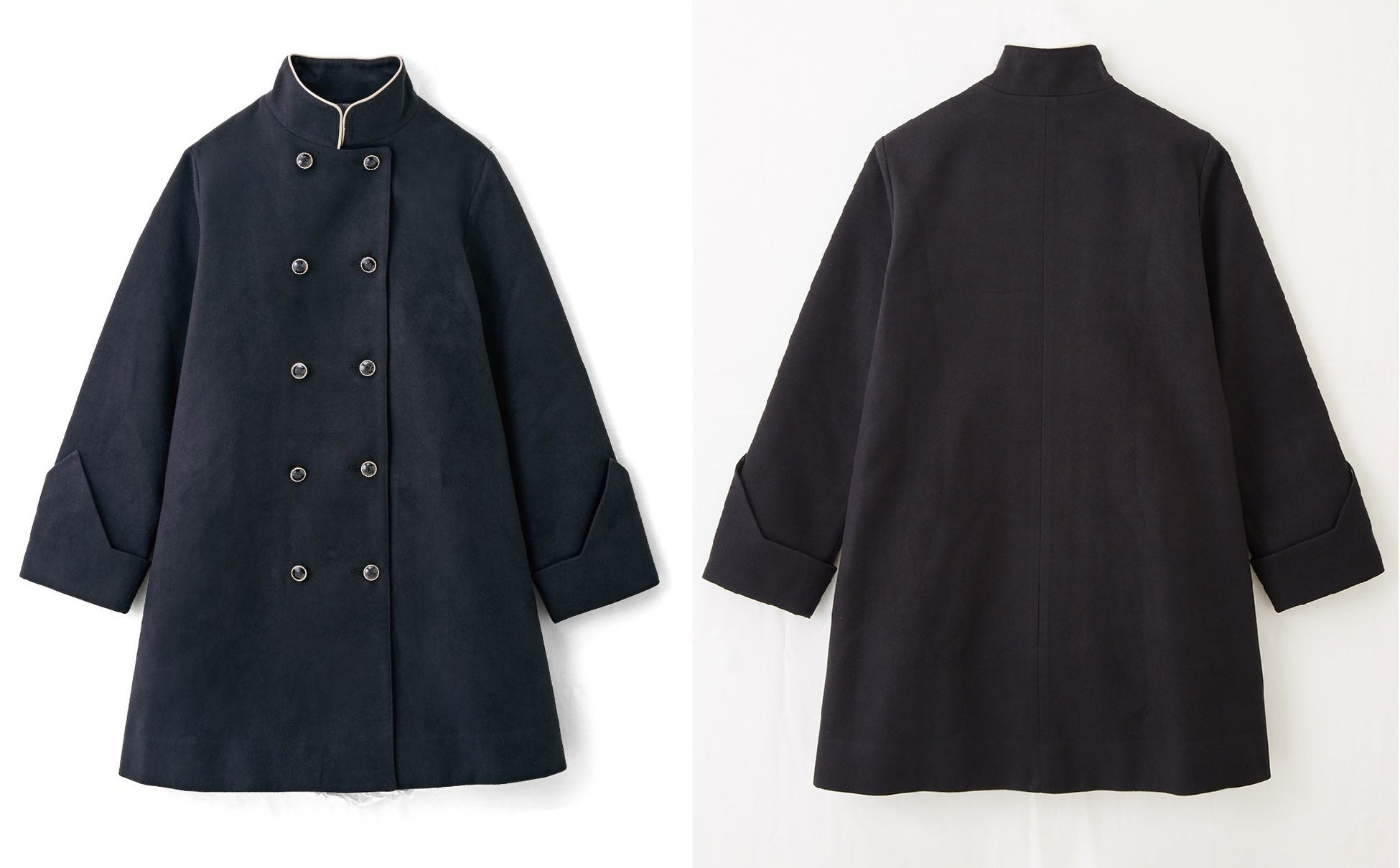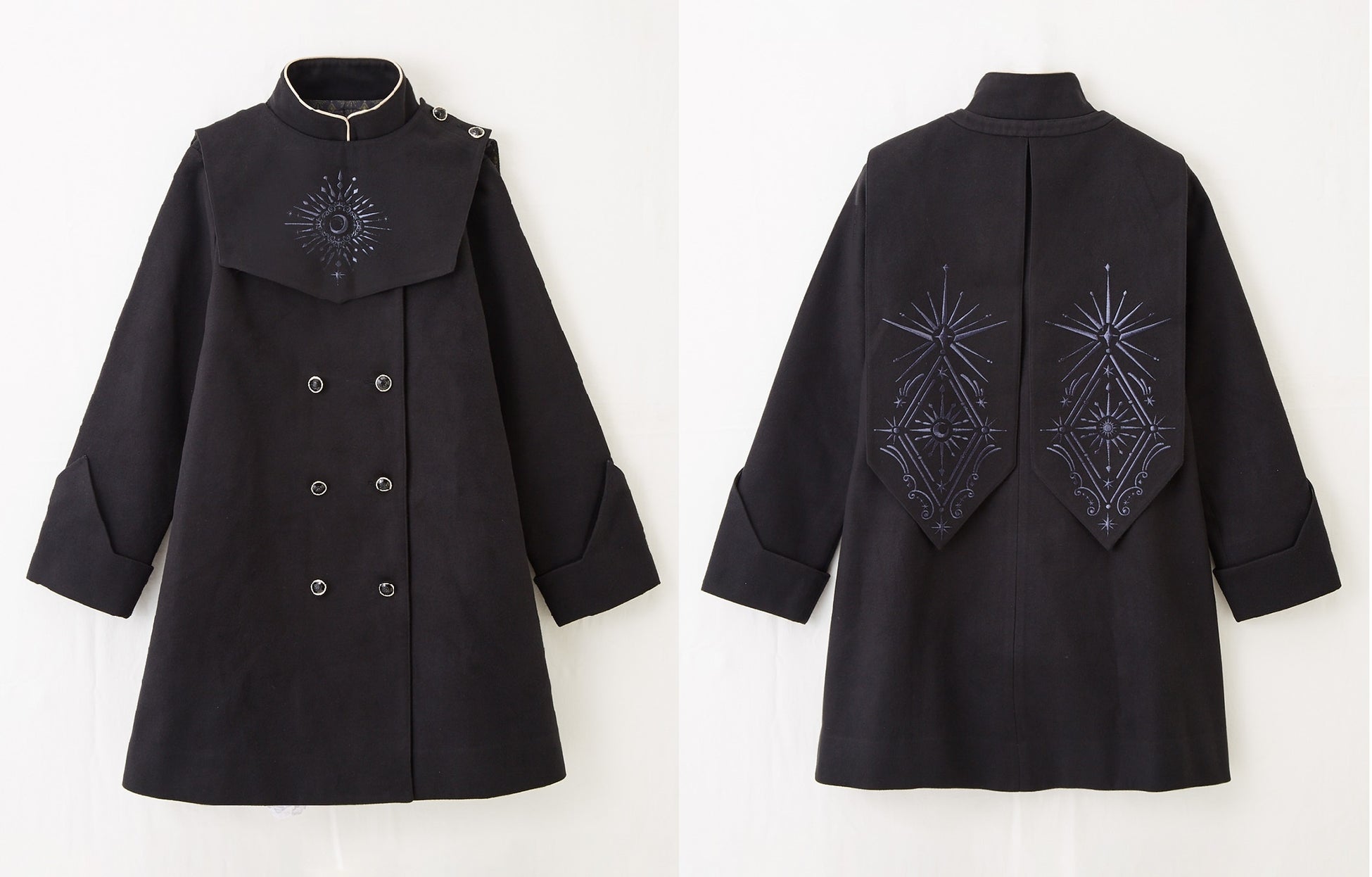 肌ざわりのいい夜色の生地に、ボタンがずらりと並ぶシックなデザインです。大きな付け衿はかっちりとしたテイストで、魔法少女のコスチュームのよう。日と月の紋章を内に秘めたコートに身を包み、今日という日を守りましょう。