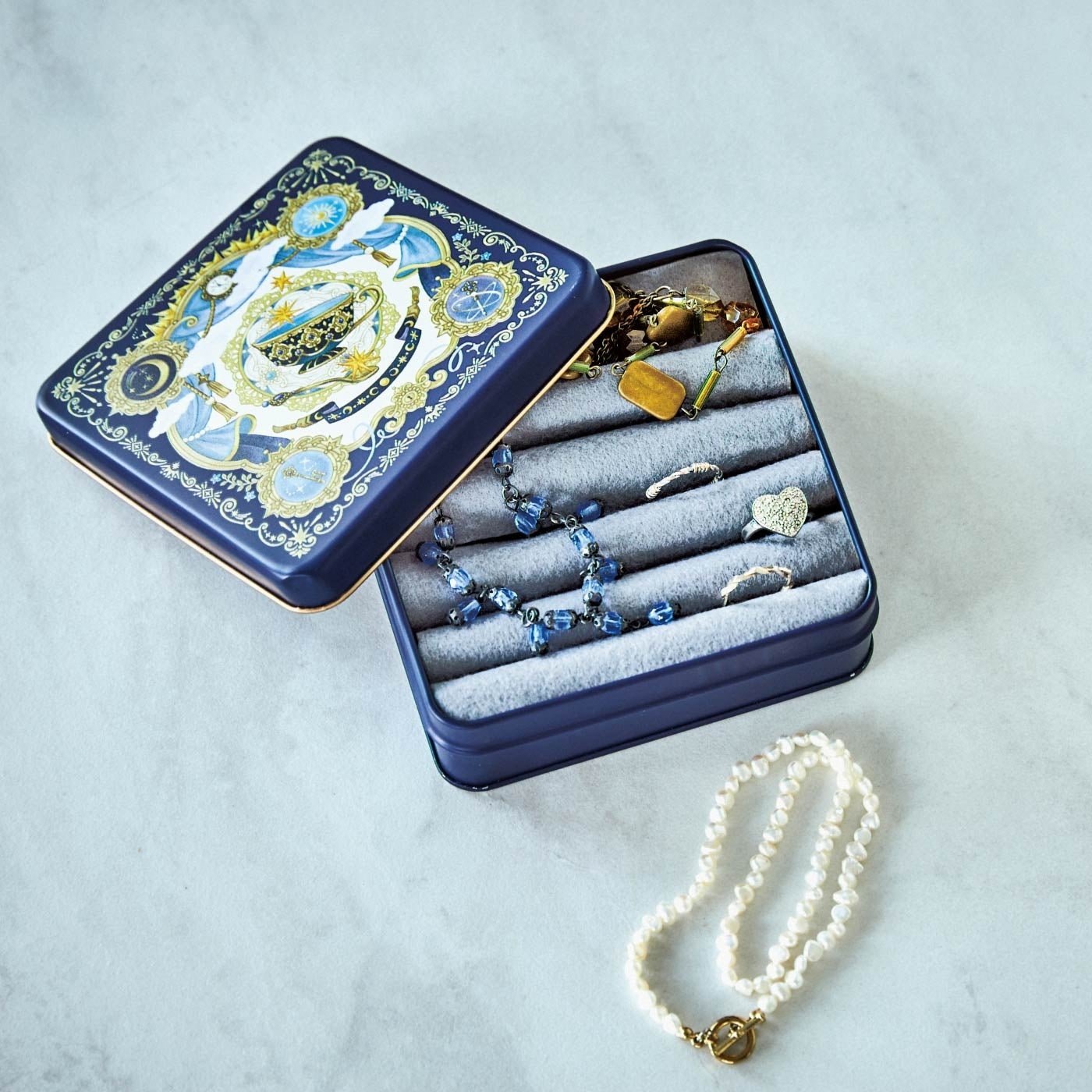 きらめく月と星、魔法の杖やかぎをあしらった美しいデザインの缶はfouatons描き下ろしデザインです。まるで夜明けの星のように色が変わる不思議なハーブティーが20杯分収められています。