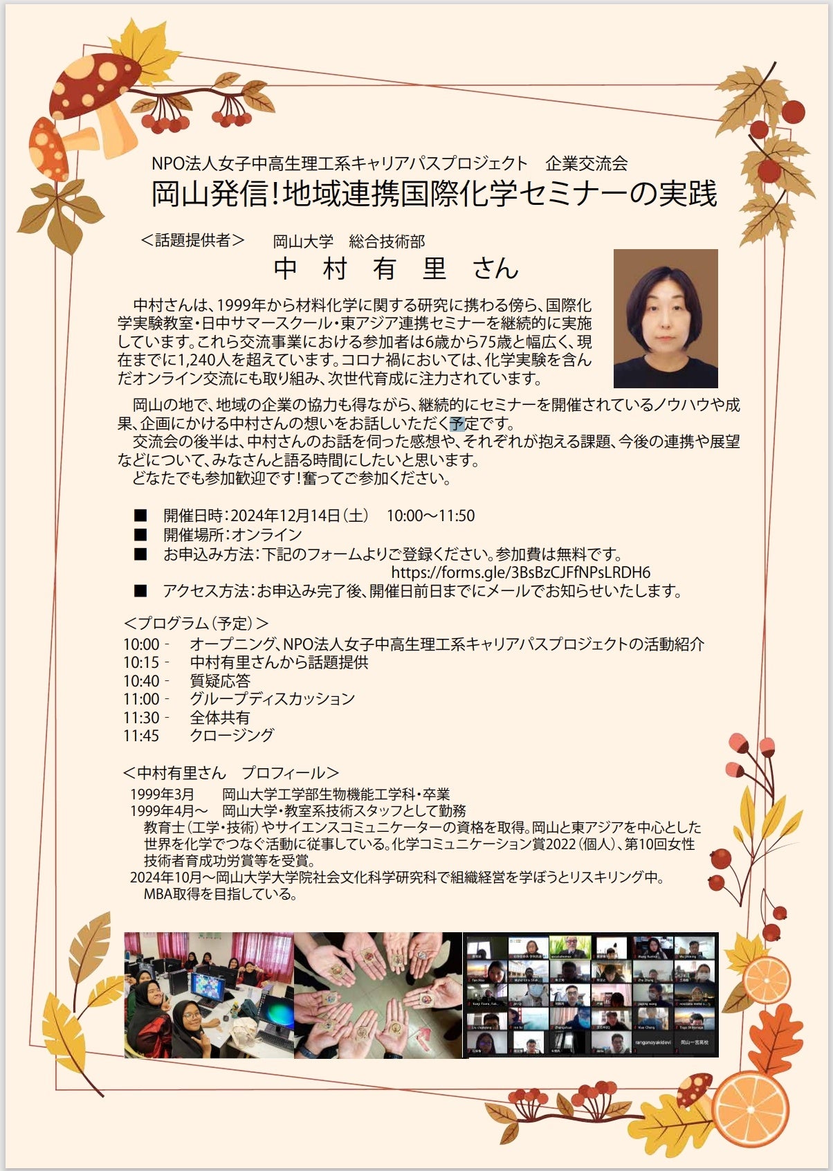 【岡山大学】オンライン・女子中高生理工系キャリアパスプロジェクト交流会〔12/14,土〕